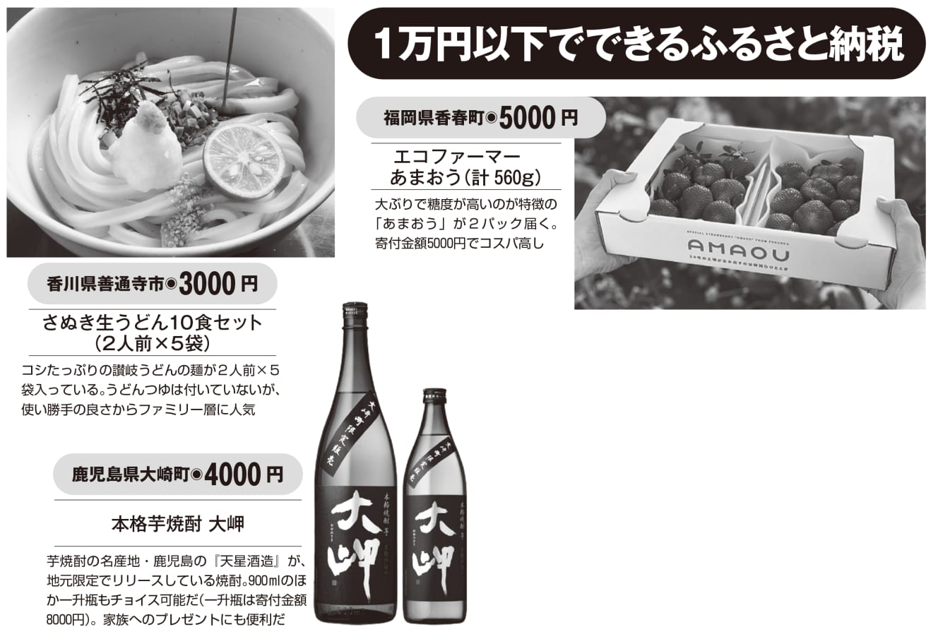 Zentsuji City in Kagawa Prefecture offers 10 servings of authentic Sanuki udon noodles for a donation of 3,000 yen. Sake makes a great gift, and if you donate 4,000 yen to Osaki Town in Kagoshima Prefecture, you can get a locally produced limited edition potato shochu.