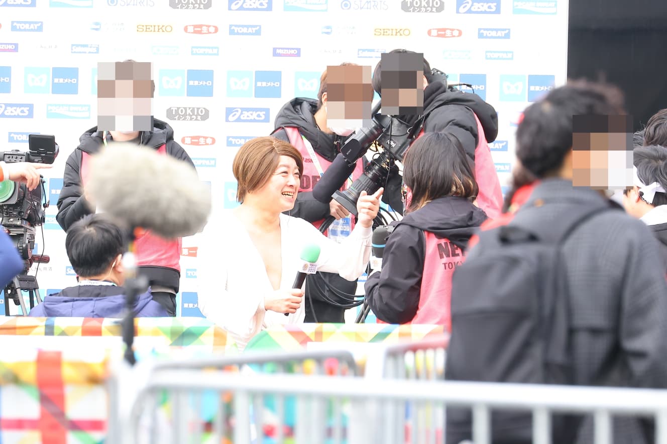 This year, Fuji Television broadcasted the Tokyo Marathon exclusively live. The reporter continues, “The Tokyo Marathon was broadcast live exclusively by Fuji Television.
