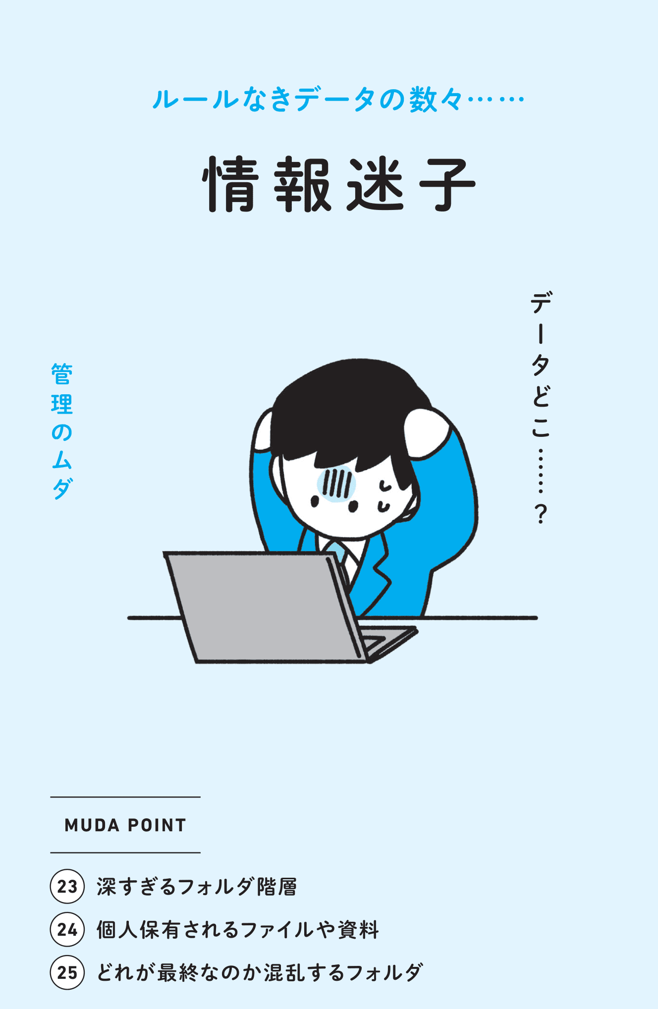 Furthermore, files and folders that are managed in an inappropriate manner are also a cause of “waste. Files and folders that are not clearly visible to the user can be difficult to find. According to some statistics, the average business person wastes 150 hours a year searching for files and folders. This is because they manage their data according to their own rules. Digital data, unlike paper, is invisible, so it is easy to lose track of its location.