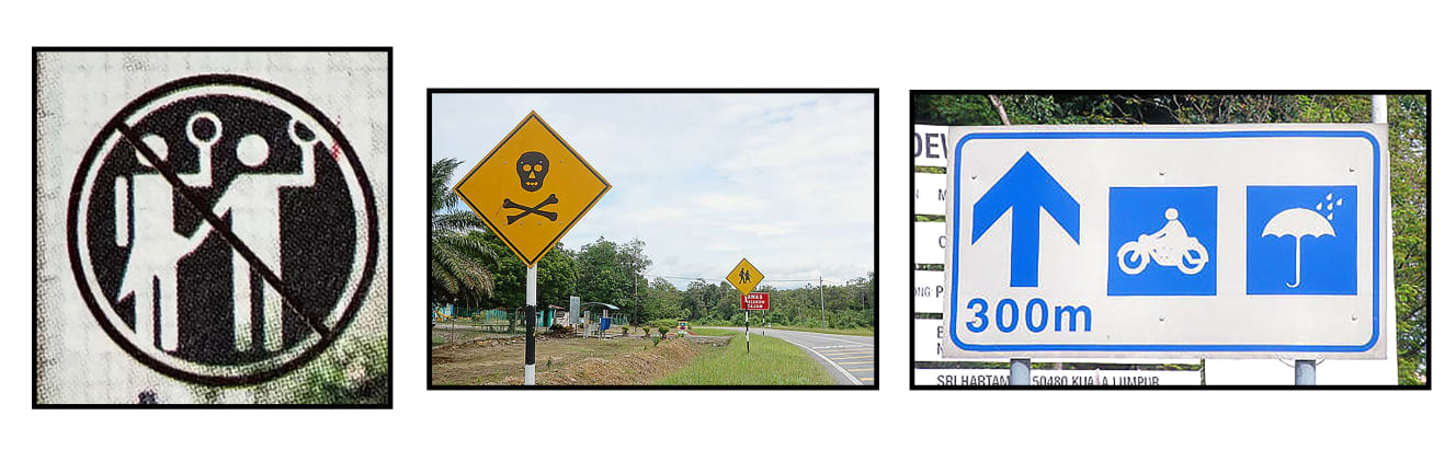 The interesting thing is that the designs change depending on the climate, religion, and culture. Some of them are only recognizable to the inhabitants of the country when you see them for the first time. For example, in Malaysia, where squalls are common, there are signs on the traffic signs indicating places to take shelter from the rain, and in Namibia, where public transportation is scarce, there are signs prohibiting hitchhiking, as many people seem to do. It is fascinating to see how succinctly a country’s national character is expressed.