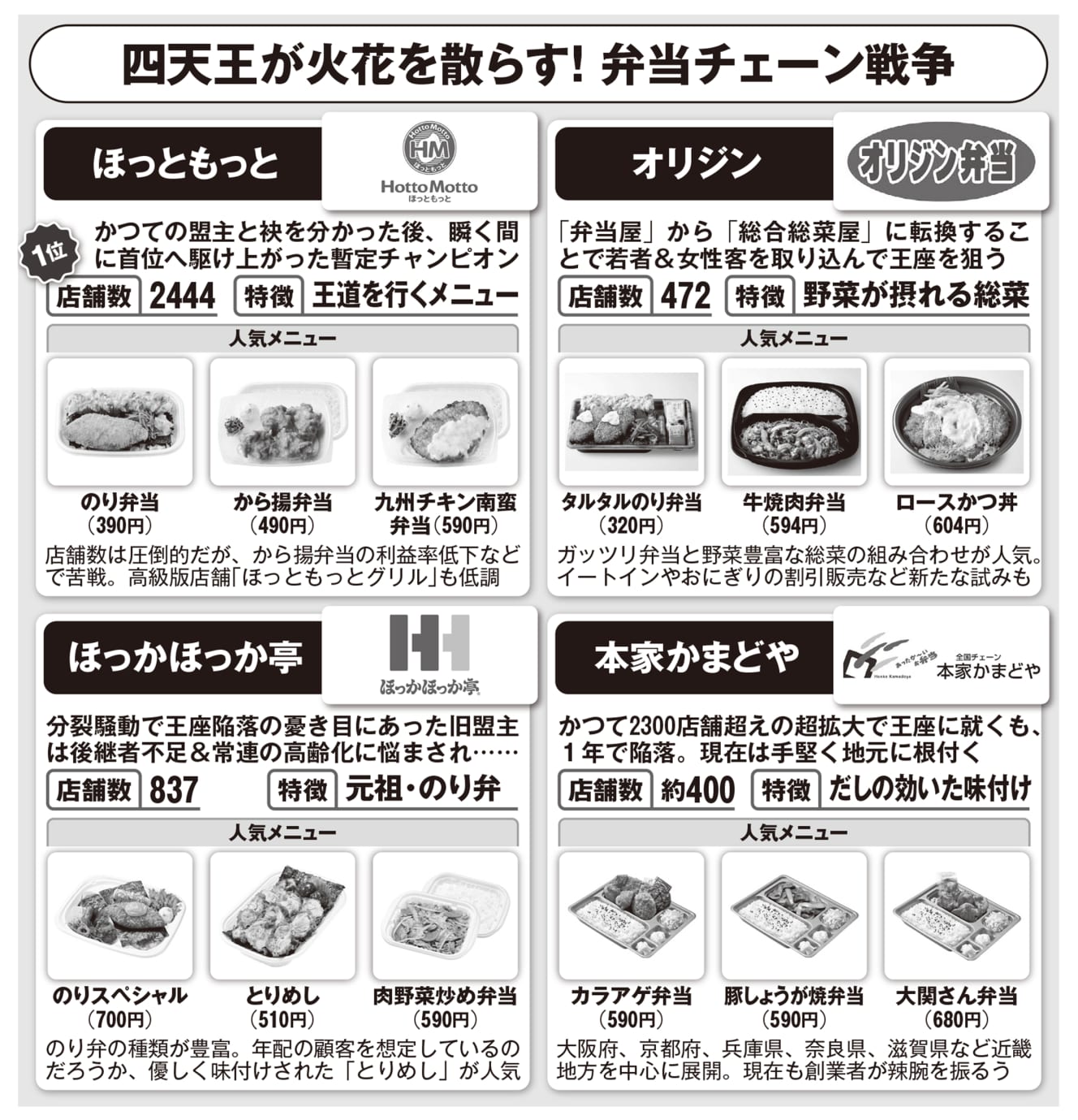 The former leader of a major empire has stalled after being stabbed in the back by a close confidant, the champion has outgrown its massive size, a Kansai hero who has been in the market for three days is on the defensive in his hometown, and an old powerhouse is looking for a new challenge to take the upper hand. The rise and fall of the “Four Heavenly Kings” of bento chains is like that of the Warring States Period. The heated competition is entering its second chapter.