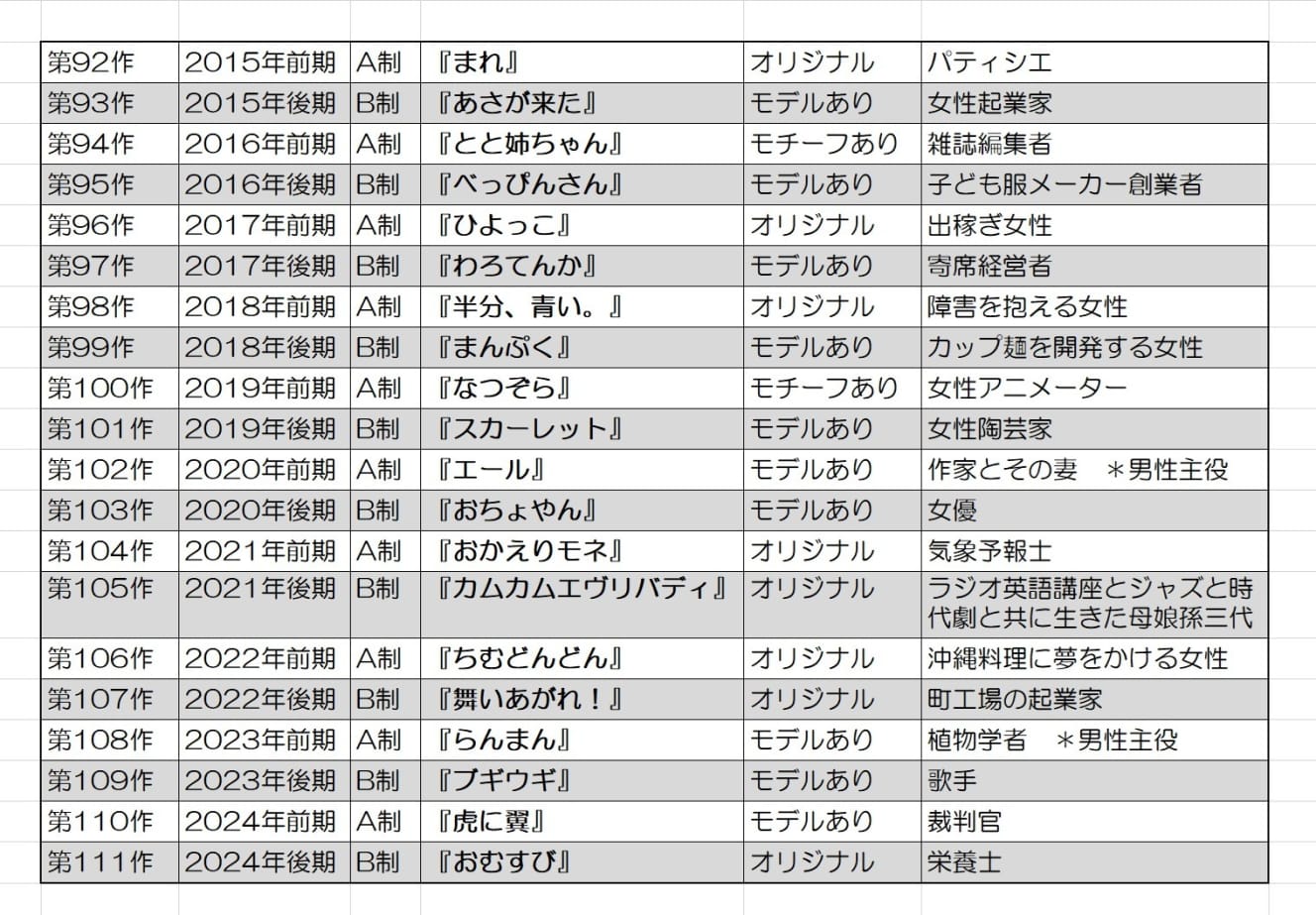Next, we can identify the “main characters.” In the A series, in order of broadcast order, there were a pastry chef, magazine editor, migrant worker, disabled woman, female animator, writer and his wife, weather forecaster, woman who dreams of Okinawan cuisine, botanist, and judge, while in the B series, also in broadcast order, there were a female entrepreneur, founder of a children’s clothing manufacturer, yoseban proprietor, and cup noodles maker, A female entrepreneur, the founder of a children’s clothing manufacturer, a yose owner, a woman who develops cup noodles, a female potter, an actress, a mother-daughter-granddaughter triplet who lived with a radio English class, jazz, and period drama, an entrepreneur of a local factory, a singer, and a nutritionist” in the same broadcast order.