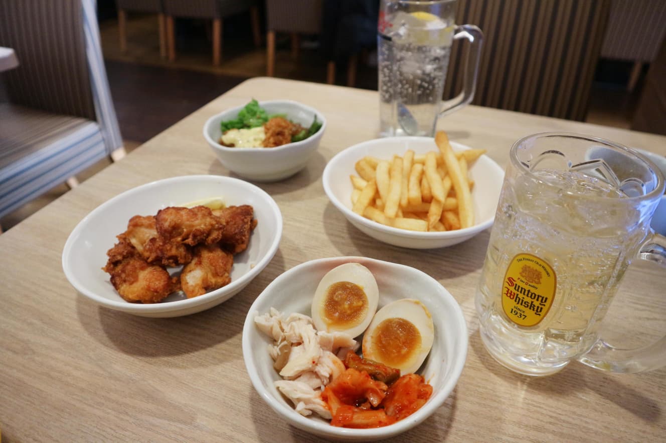 I managed to order a Kaku highball and a not-so-sweet lemon sour. The snacks include kimchi, a little pizza, and fried chicken.