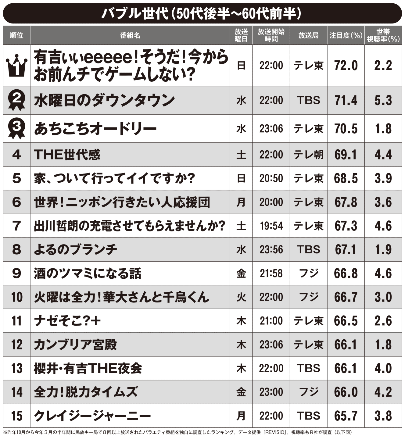 Let’s take a look at each generation. In the “Bubble Generation,” the number one program is Ariyoshi eeeee! (TV Tokyo), a show where host Hiroiki Ariyoshi (50) and comedians play online games together. It might seem surprising that viewers in their late 50s to early 60s are so fond of it, but this is the same generation that grew up with arcade games and the original Famicom.