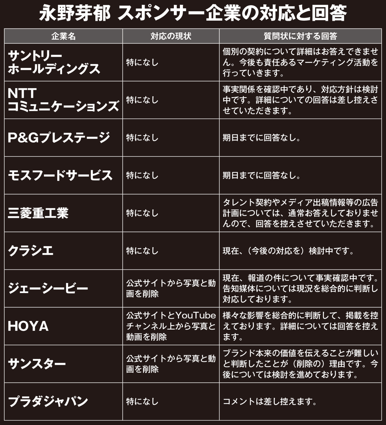 What decision will the sponsor companies of the commercials featuring Nagano make? FRIDAY interviewed 10 sponsors about their future use of Nagano and how they have responded to the series of reports. The table summarizes each company’s response and stance as of May 12.