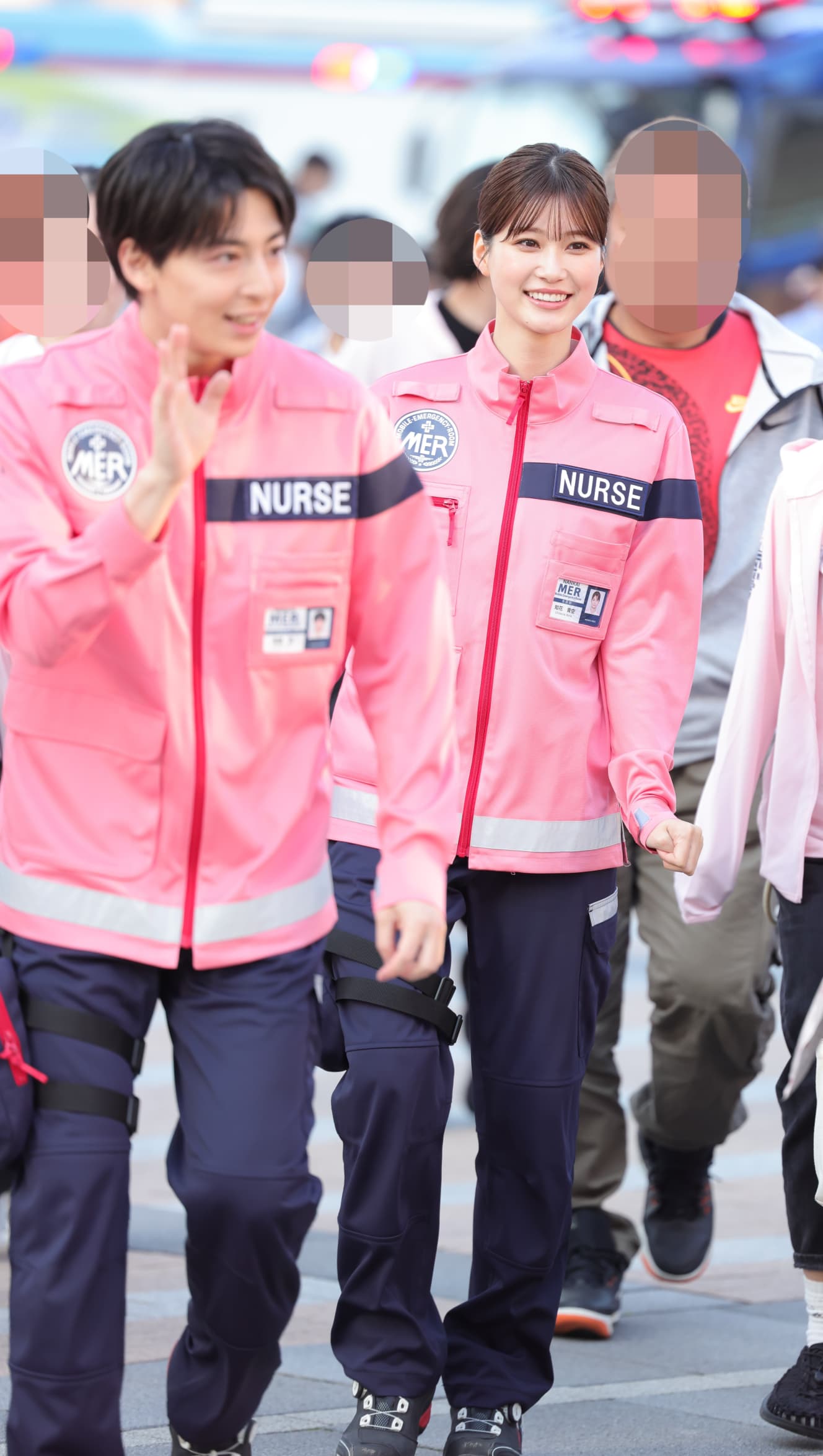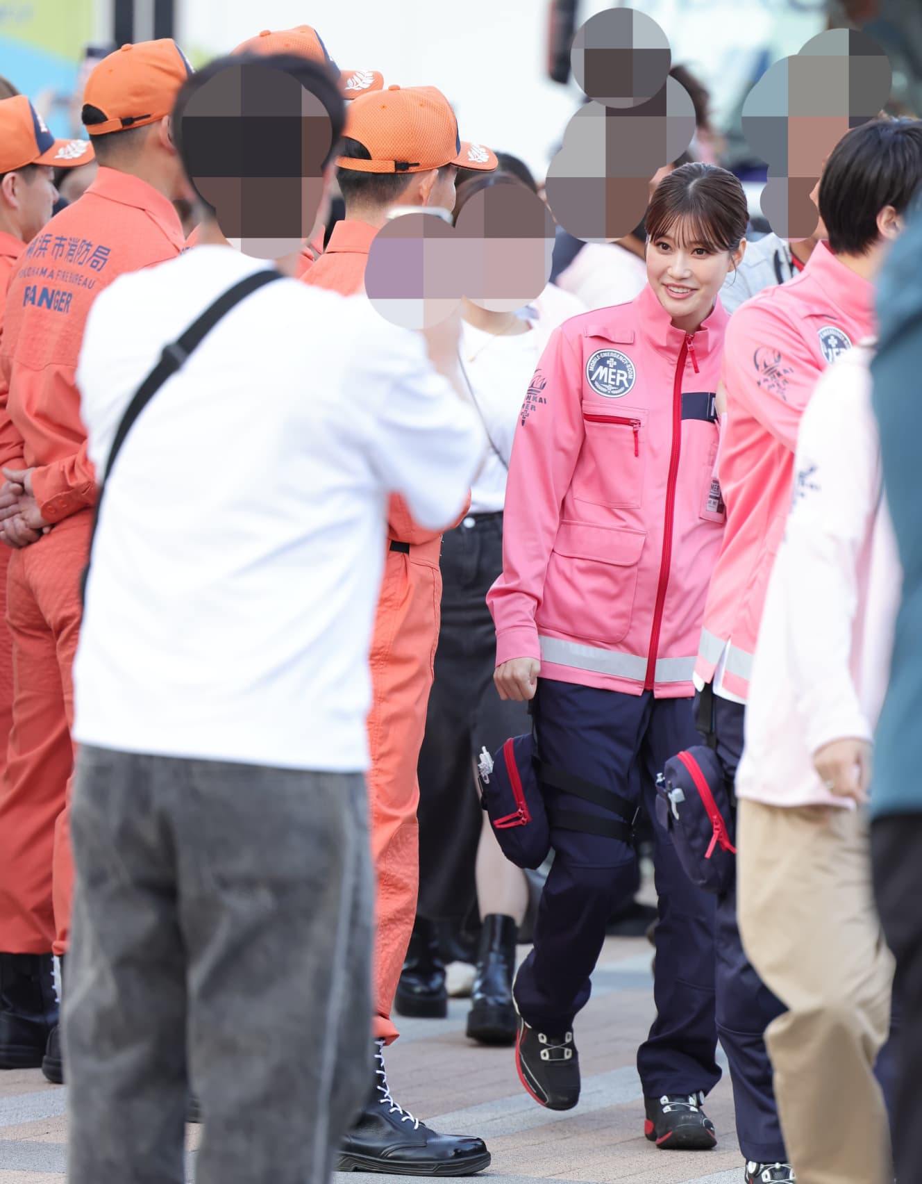 After a while, Meruru and Mahiro Takasugi (28), dressed as paramedics, appeared in front of a line of real Super Rangers from the Yokohama Fire Department.