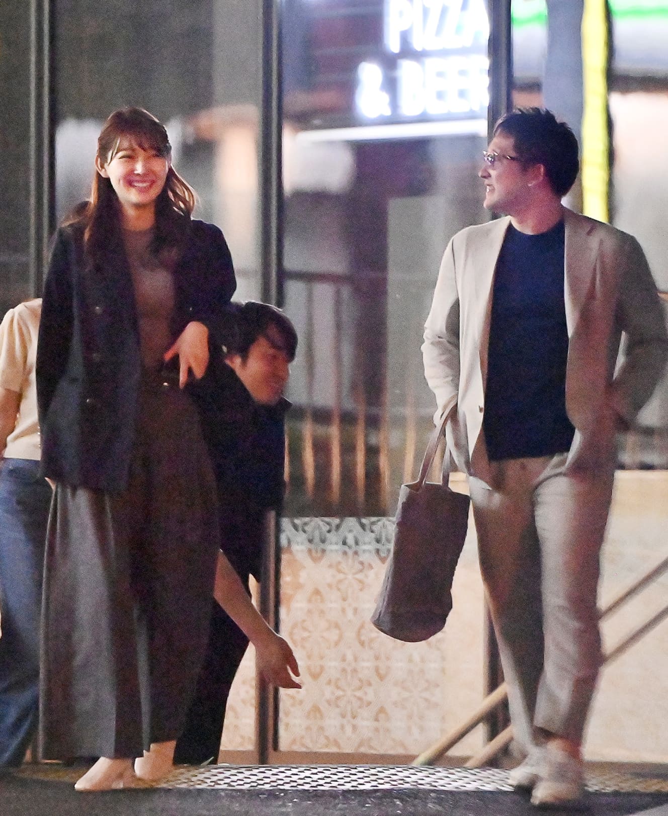 Following behind the tipsy Sugiya were three cheerful young men and women. Among them was a tall woman in a black jacket—believed to be Minami Moriyama (26), an announcer at TV Asahi.