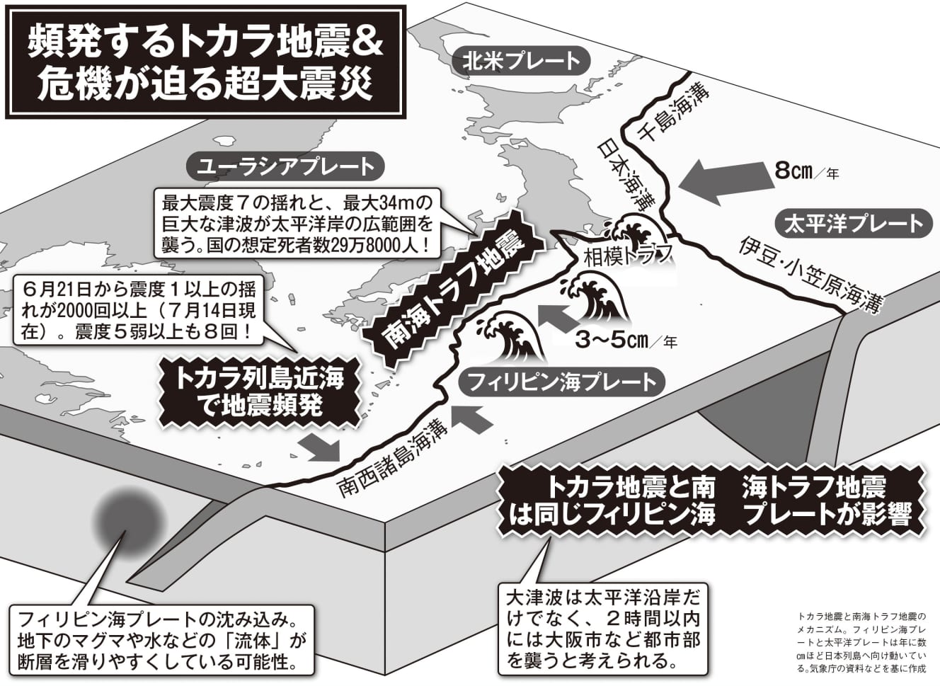 Earthquakes have been occurring frequently in the seas around the Tokara Islands, with more than 2,000 tremors of intensity 1 or higher occurring since June 21. As of July 14, there have been eight epicenters of intensity 5 or lower. It is no wonder that the residents are exhausted. Junzo Kasahara, professor emeritus at the Seismological Research Institute of the University of Tokyo, said, “The Tokara Archipelago is located in the Philippines.