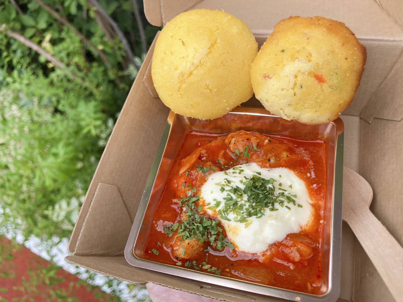 When I opened it, it looked like this (below). The pani is apparently the soup, and inside the box were round, light, fried balls, a casually included tube of soup, and something like potato salad with beans. In other words, you’re supposed to poke a hole in the crispy round balls, stuff in the potato salad, and pour the soup over them.