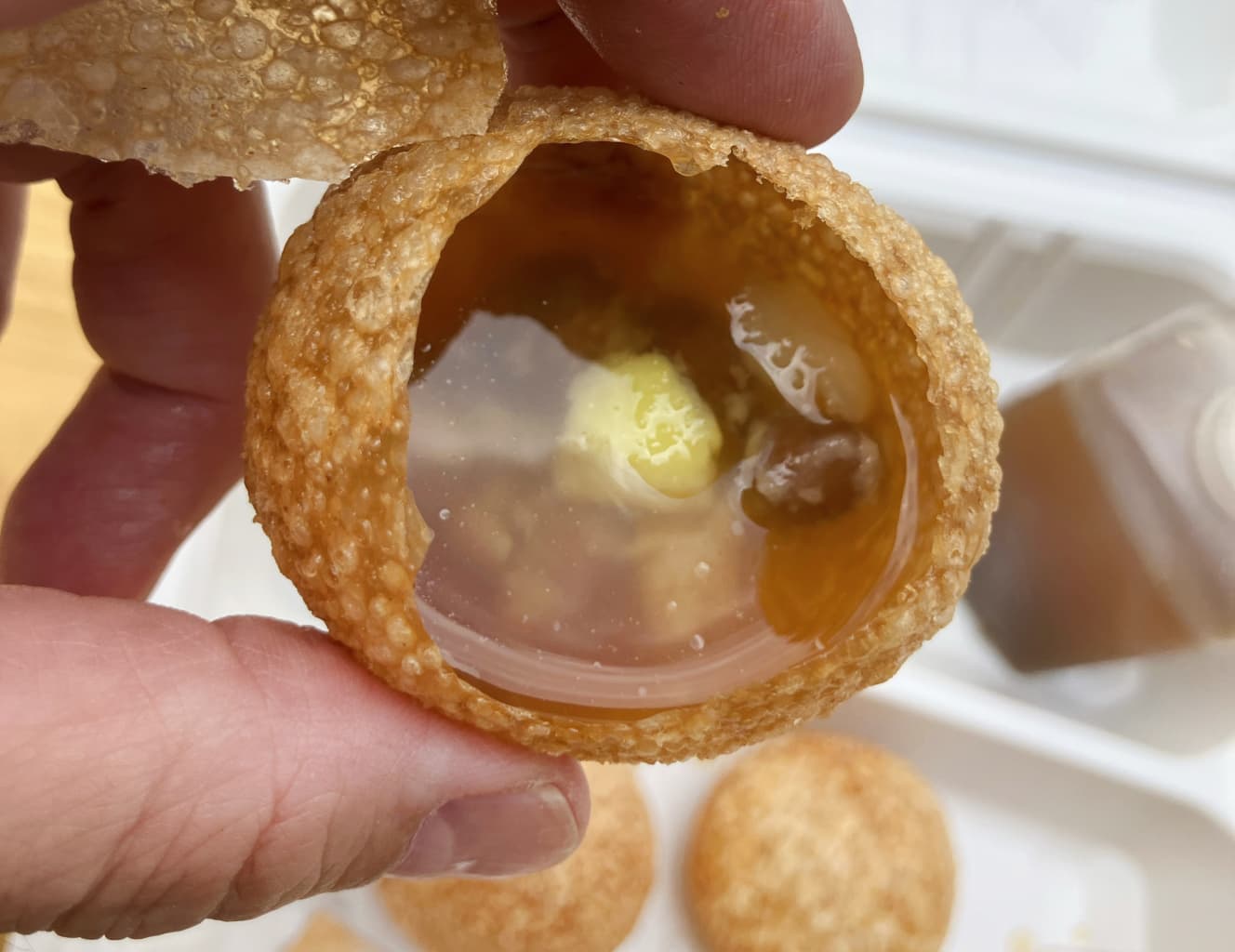 The crispy shell filled with potato salad, chickpeas, and cold soup bursts in your mouth. The soup has a strong tamarind flavor, with a tangy taste and a unique aroma thanks to a blend of spices like cayenne pepper.