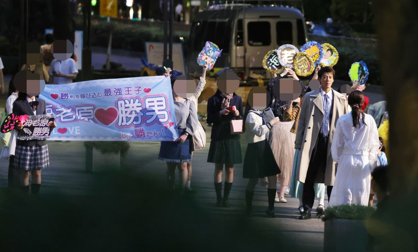 “Filming took place in mid-July on a sidewalk near the Tokyo Metropolitan Government Building. Dressed like a salaryman, Takeuchi stood in front of a group of young women holding banners and uchiwa reading ‘The strongest prince who brings victory—Katsuo Ebihara is the only one!’ He faced actress Kaho (34) across from him. Many foreign tourists were nearby, watching curiously,” said a bystander.