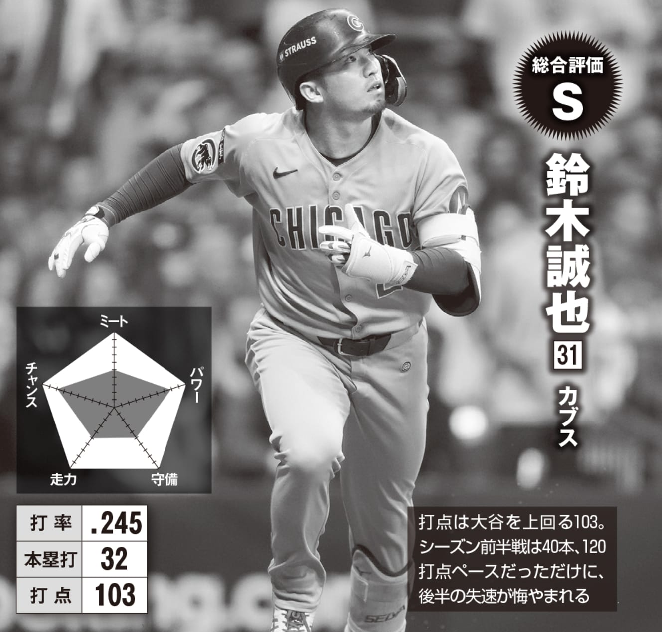 “Aside from Ohtani, the hitter who performed best this year was Seiya Suzuki (31) of the Cubs. His batting average was .245, lower than last year, but he hit 32 home runs, surpassing Hideki Matsui’s record of 31. This is the second-highest total ever by a Japanese MLB player, behind only Ohtani. He also cleared 100 RBIs, which adds to his evaluation. However, once he stops hitting, his slumps tend to last a long time. This instability lowers his rating a bit.” —Nakahiro Tokutsu, NPB analyst