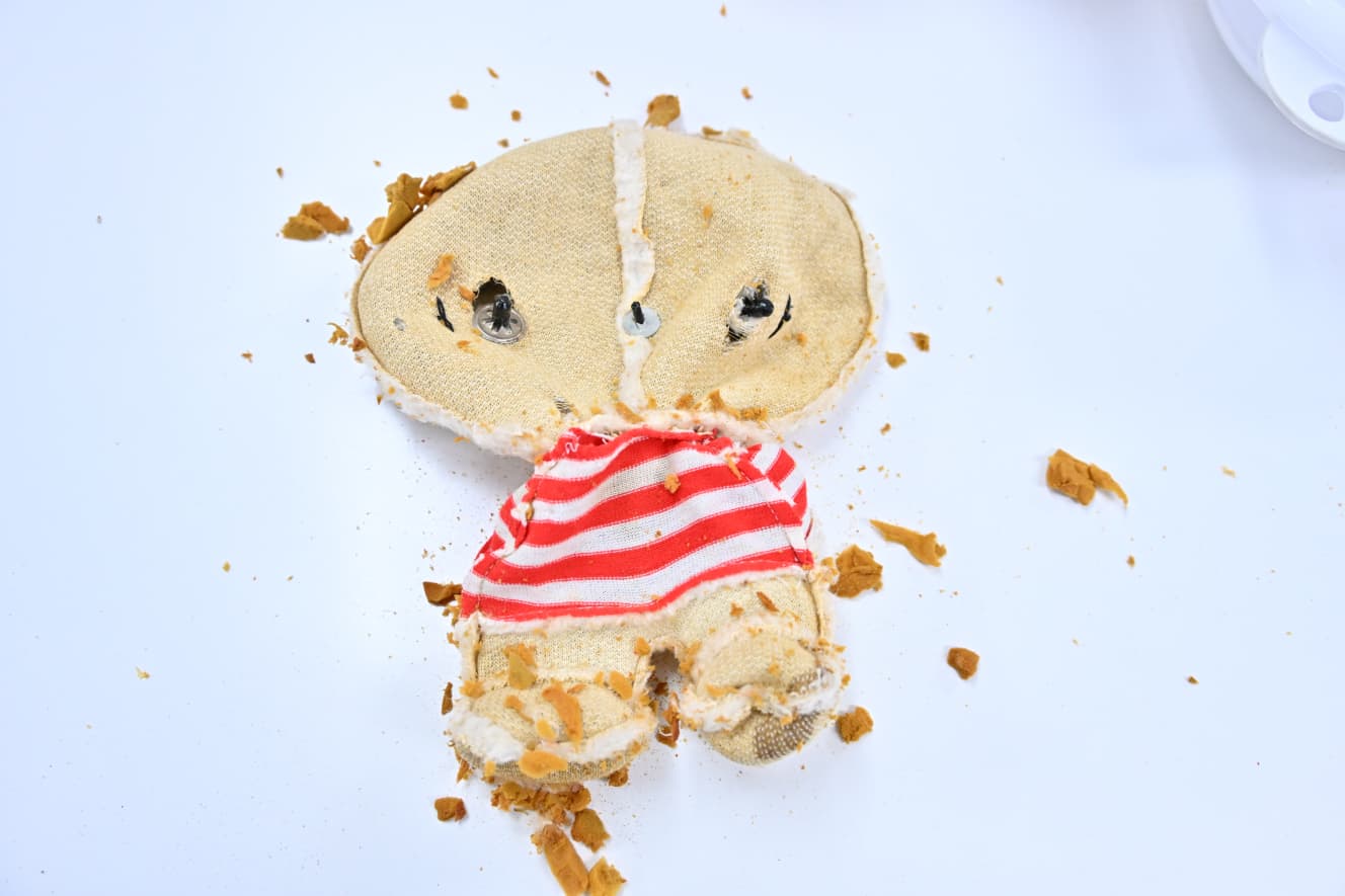 First of all, Mr. Hakozaki removed Kitty’s clothes. Then, the old stuffed animal’s cotton powder began to fall out.
