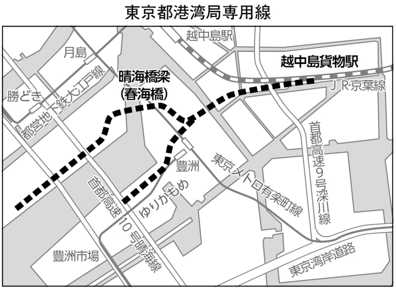 The Tokyo Bay freight line between Shiodome and Shibaura Stations was constructed after the U.S. military seized the Shibaura Pier after the war, and the Toyosu Pier was built in its place. The Toyosu Line opened in 1953, and the Harumi Line, a branch of the Toyosu Line, in 1957. However, the Toyosu Line was discontinued in 1986 and the Harumi Line in 1989, as the mainstay of freight transportation shifted from rail to truck.