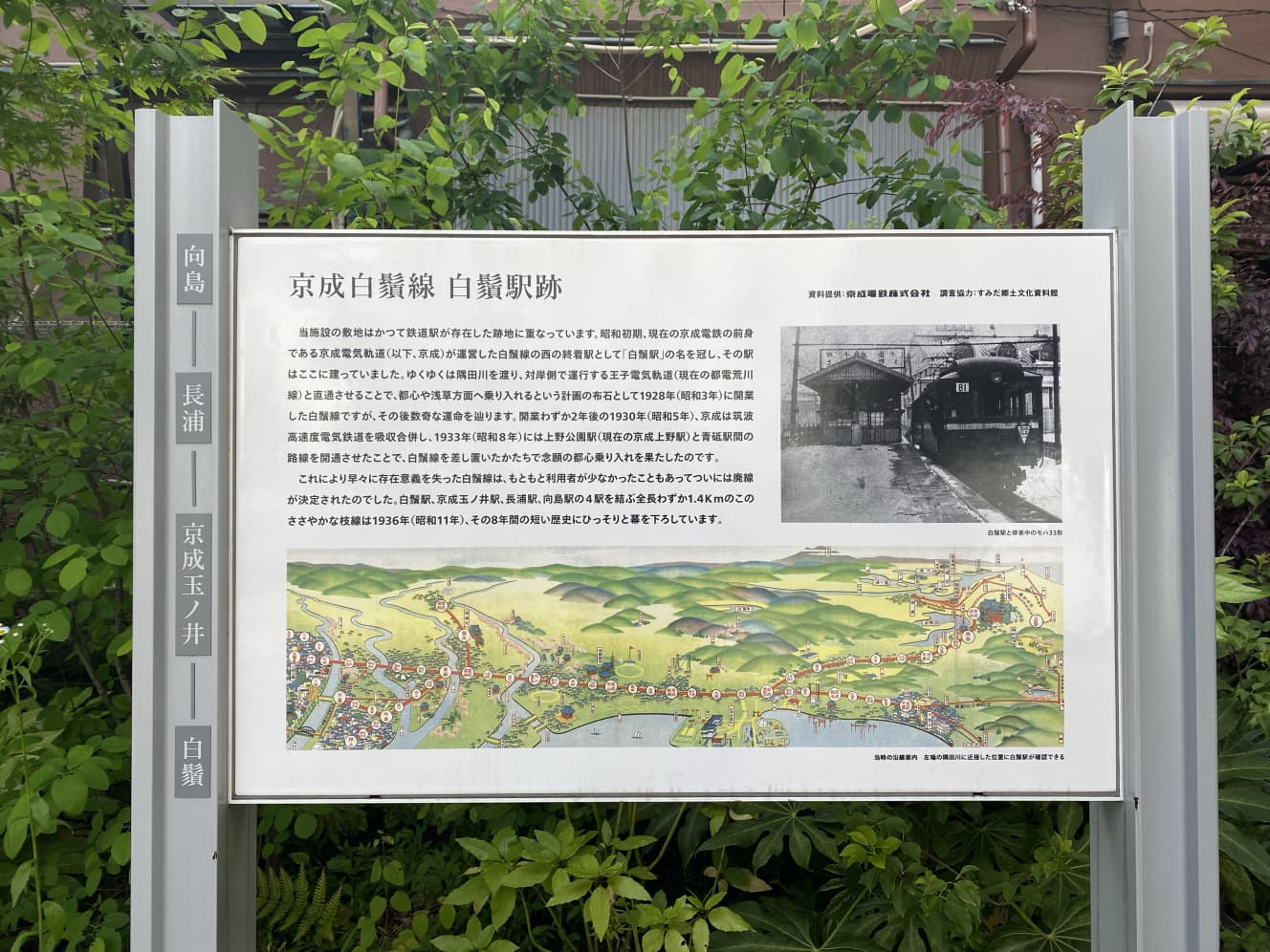 However, at the entrance of a new welfare facility built on the site of the old Shirahige station, an information board about the station had been erected, and when we talked to the facility staff, they told us that the metal supporting the board was the actual rail used for the Keisei Shirahige line, which was found when the ground was dug out of the ground. I was so happy to see that the rail had been preserved in such a way. ……