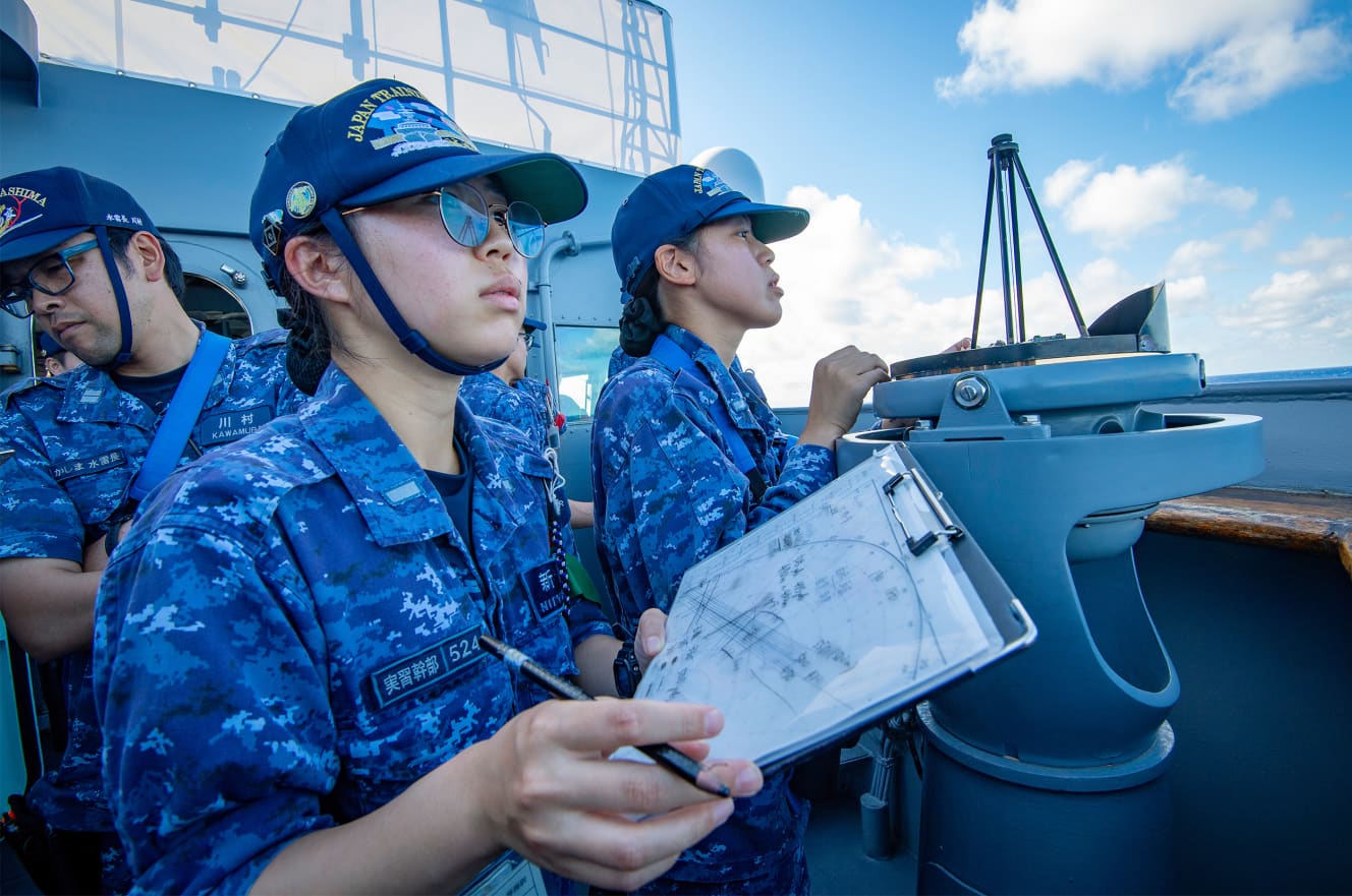 On the balcony-like area jutting out next to the bridge of Kashima, called the wing. a group of young men and women in their early twenties fumble nervously. These are the JMSDF’s trainee officers, known as practical officers.