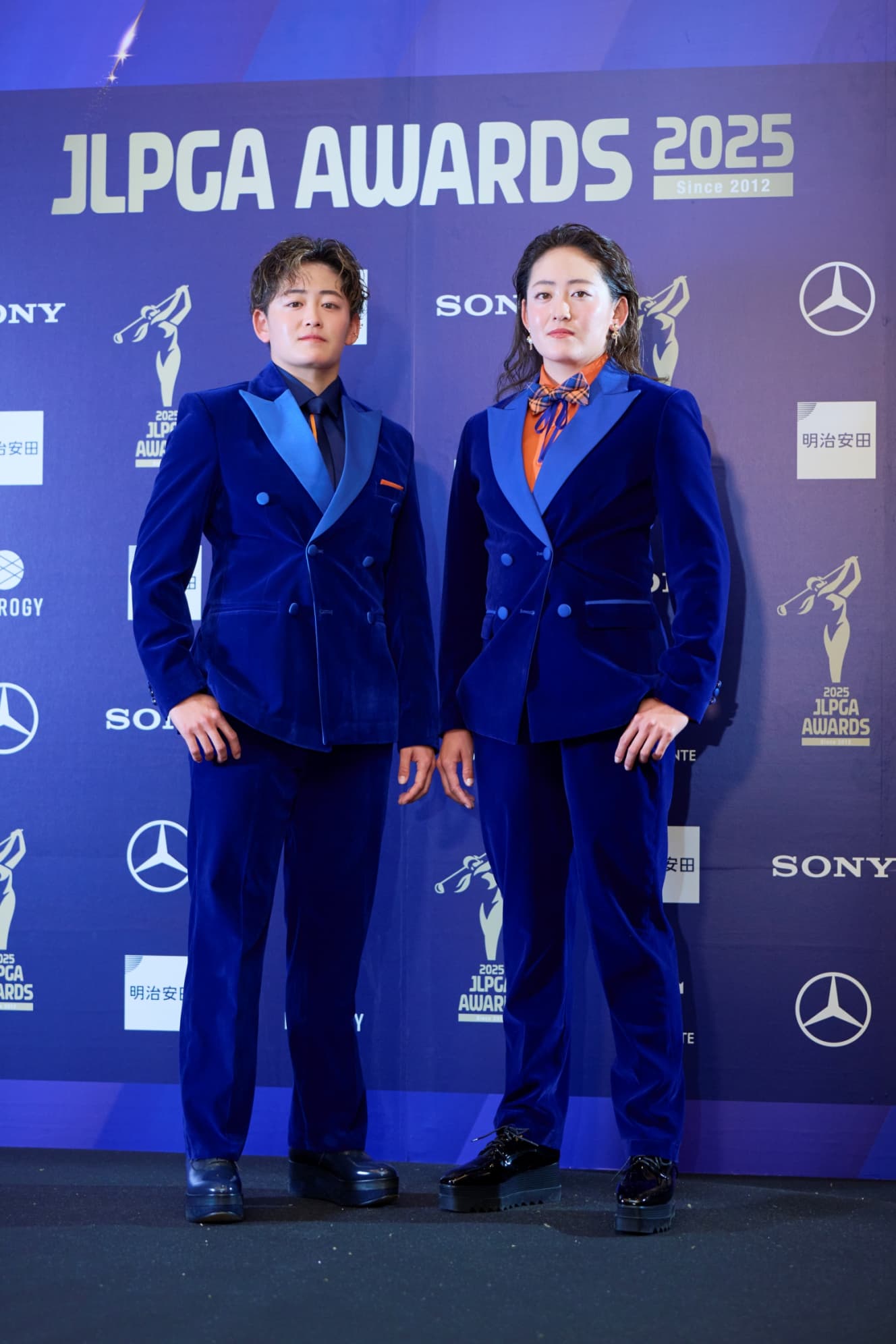 Older sister Akie Iwai (23) and younger sister Chirei Iwai (23) achieved the first-ever twin victories on the U.S. tour, which they challenged from this season. On this day, they appeared in coordinated outfits. “I’d never worn blue at an event like this before,” they said, posing for a photo session in perfectly matched twin looks featuring blue jackets and pants. As for their personal touches, Akie said, “Our hairstyles. That’s probably where our individuality comes through the most.”
