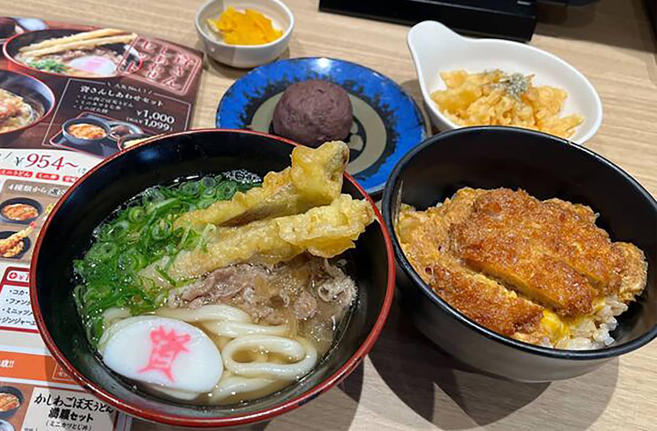 Yagyu: Recently, I’ve been interested in Sukesan Udon’s “Selectable Happiness Set” (from 909 yen). You select mini udon and mini rice bowl from four types each, and for an additional 50 yen, you can select a sweet like “Mini Botamochi.” You can taste popular items like “Meat Goboten Udon,” “Katsu Toji Don,” and “Mini Botamochi” all at once. Many Sukesan Udon stores are open 24 hours, and there is no time restriction for this set, which is also a happy point.