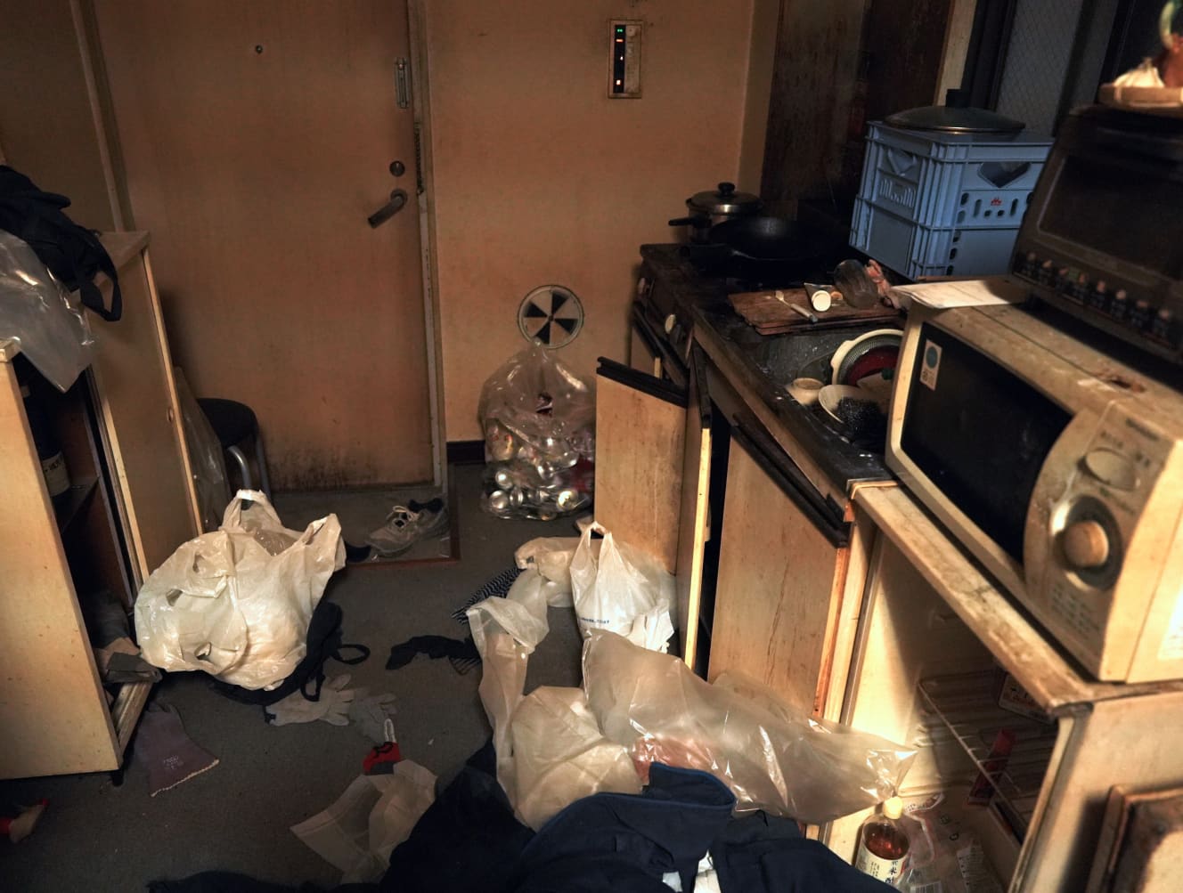 Using the light from a smartphone, I searched for the switch to turn on the room light, and a degraded fluorescent lamp cast a dim glow. From the narrow entrance, looking into the room, the roughly six-tatami-mat one-room apartment was scattered with trash. Around the kitchen area were plastic bags stuffed with empty beer cans, dishes left in the sink, and scattered coins, leaving the traces of daily life intact.