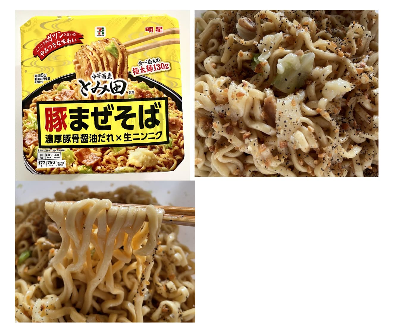 This is a cup-yakisoba-style maze soba, a 7-Premium product at 7-Eleven. The finished dish has an intense black pepper and garlic aroma. The noodles are thick and square with a chewy texture. The punchy sauce has a strong flavor that dominates the noodles, making it suitable to eat with onigiri or similar. The aroma, spiciness, and strong flavor leave a powerful impression.