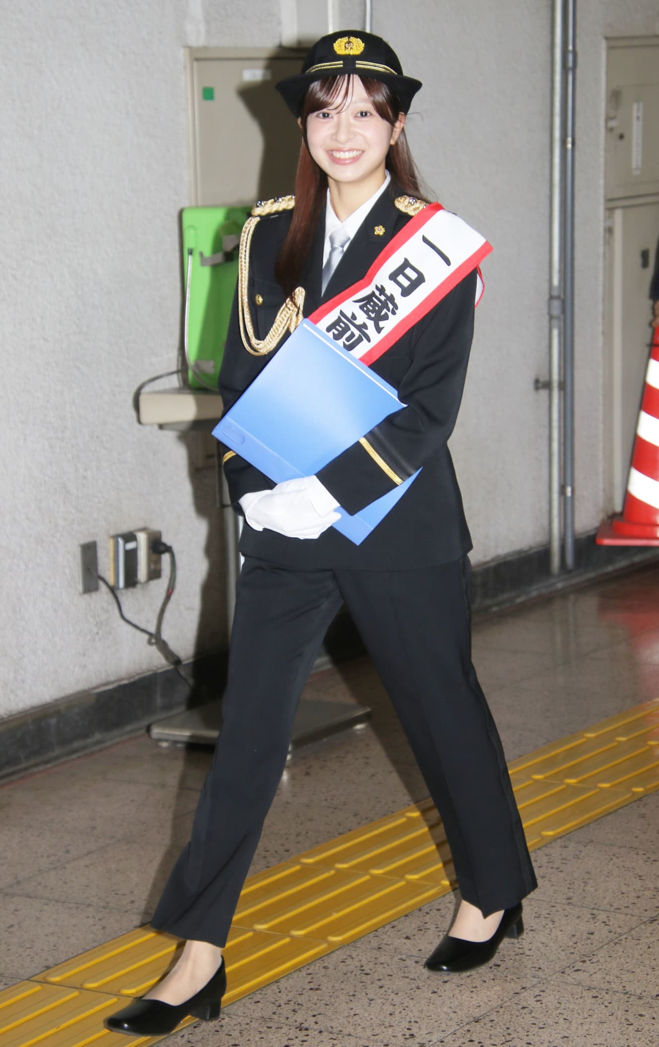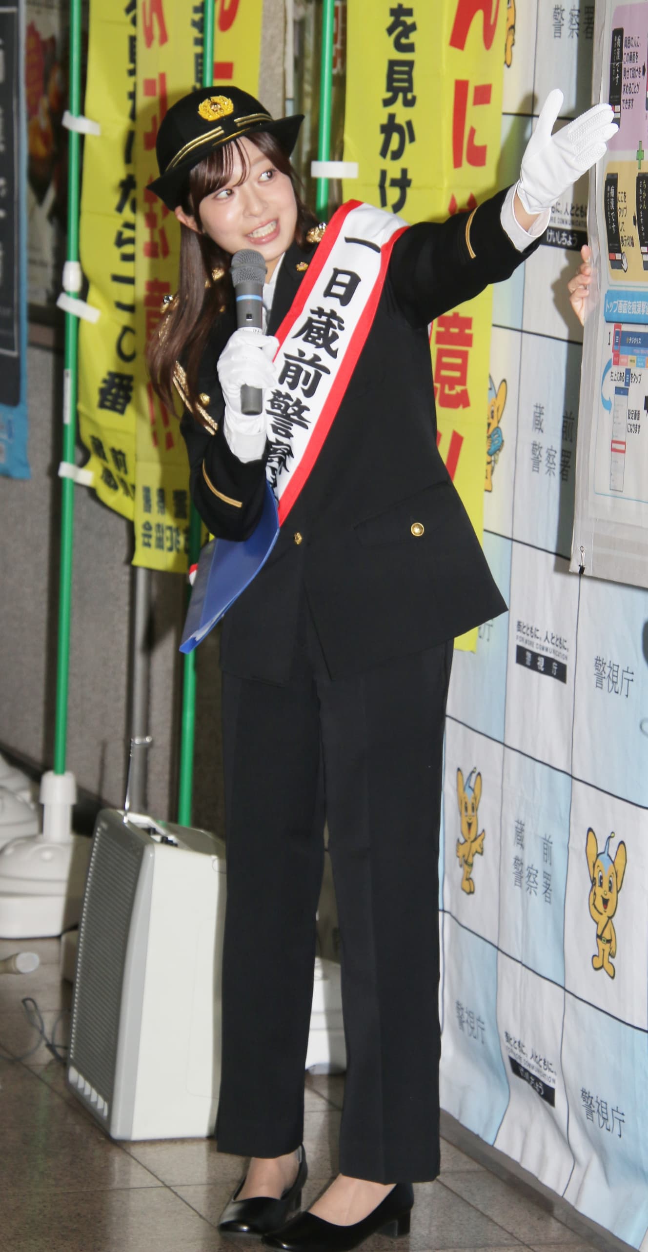 Kikuchi’s expression as she stood alongside Kuramae Police Chief Masaaki Kono, calling out warnings to users, was a little tense at first, but as she got used to the situation, she continued to call out to them with a fresh smile.