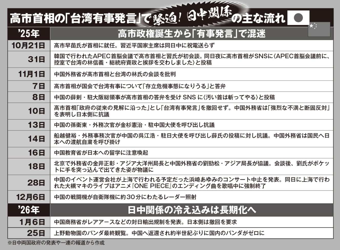 China is repeatedly making threats against Japan that can be called bizarre. The consul general in Osaka posted on SNS that he would “cut off the dirty head” of Prime Minister Sanae Takaichi (64). A diplomat appeared with his hands in his pockets after a meeting and showed condescension toward Japanese dignitaries. A concert by a Japanese artist was abruptly canceled. It also irradiated radar at a Self-Defense Forces aircraft for about 30 minutes. …… The series of Chinese provocations and the tense Japan-China relationship are summarized chronologically in the table at the end of this report.