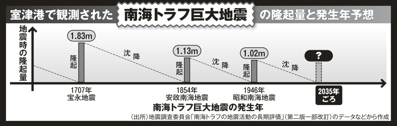 According to Kamata, the time of the next earthquake is fairly certain. “In the Nankai Trough earthquakes, there is ‘rebound uplift,’ in which the ground rises as the earthquake occurs. The amount of uplift has been measured at the port of Murozu in Kochi Prefecture since the Edo period, and it is known that the higher the uplift, the longer the period before the next occurrence.
