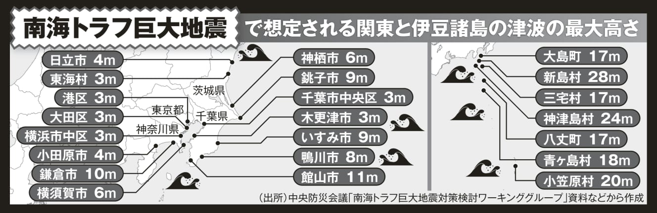 The Kanto region and the Izu Islands will also be hit by a huge tsunami of more than 10 meters. It would be large enough to submerge the many underground shopping centers in Tokyo in just 15 minutes or so.