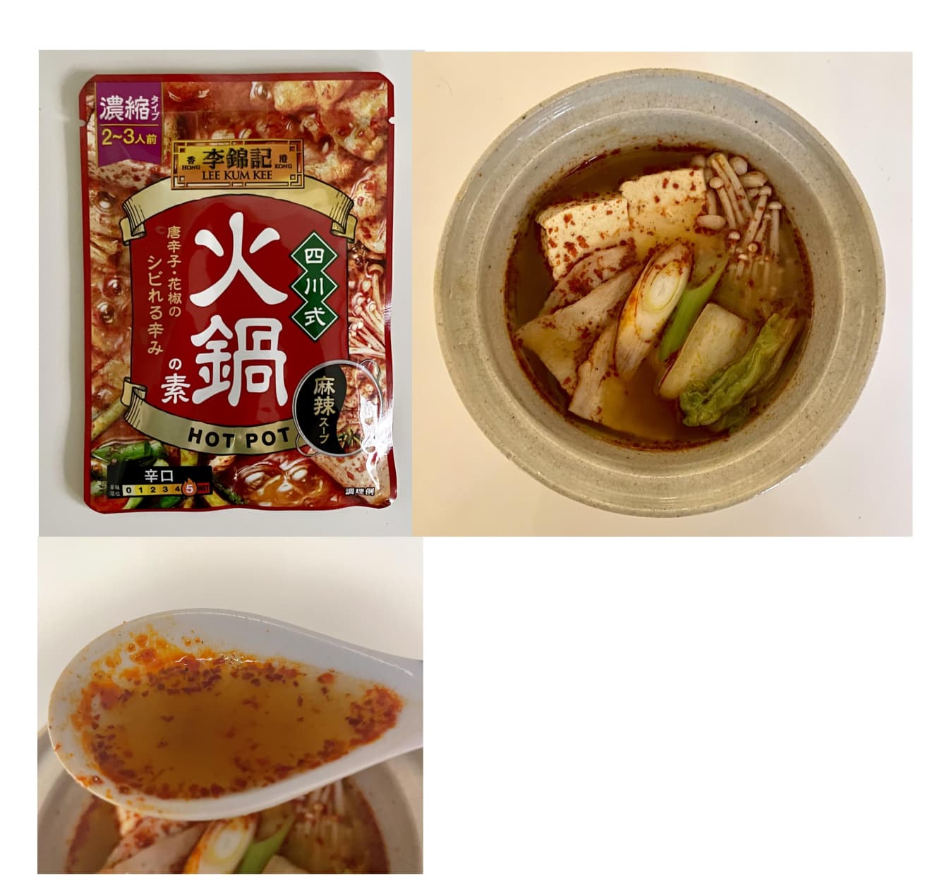 This is a soup stock of Li Jin Ji. The spice-driven, clean-tasting soup has a spicy punch with floating powdered chili peppers. It has a flavor that complements the ingredients while not overpowering them, so it can be enjoyed with meat, vegetables, vermicelli, tofu, or anything else you like.