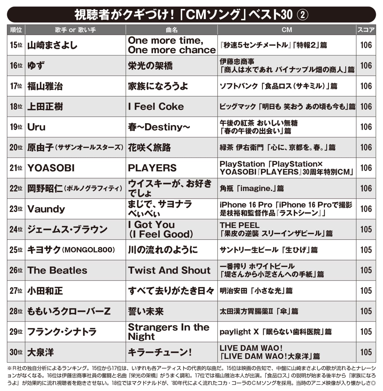 MISIA (47)’s “Be KIND” (No. 2) and Babydolla’s “Today, for example” (No. 3) are both played in commercials with little explanation of the product or company. Mr. Yasutake speaks.