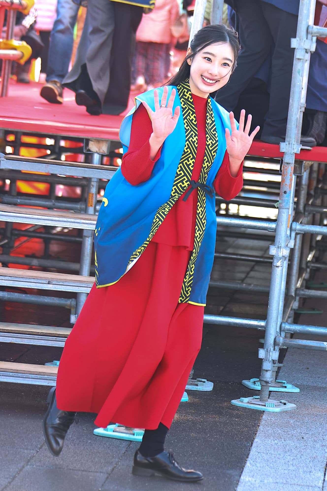 At Naritasan Fudo Temple (Naritasan Osaka Betsuin Meioin Temple, Neyagawa City, Osaka Prefecture), which is known for “traffic safety prayers,” a special stage was set up at 1:00 p.m. with the cast of “Toyotomi Brothers! Minami Hamabe, 25, who plays Nene in “Toyotomi Brothers!” appeared in a pink haori hakama with Sousuke Ikematsu, 35, who plays Hideyoshi Toyotomi.