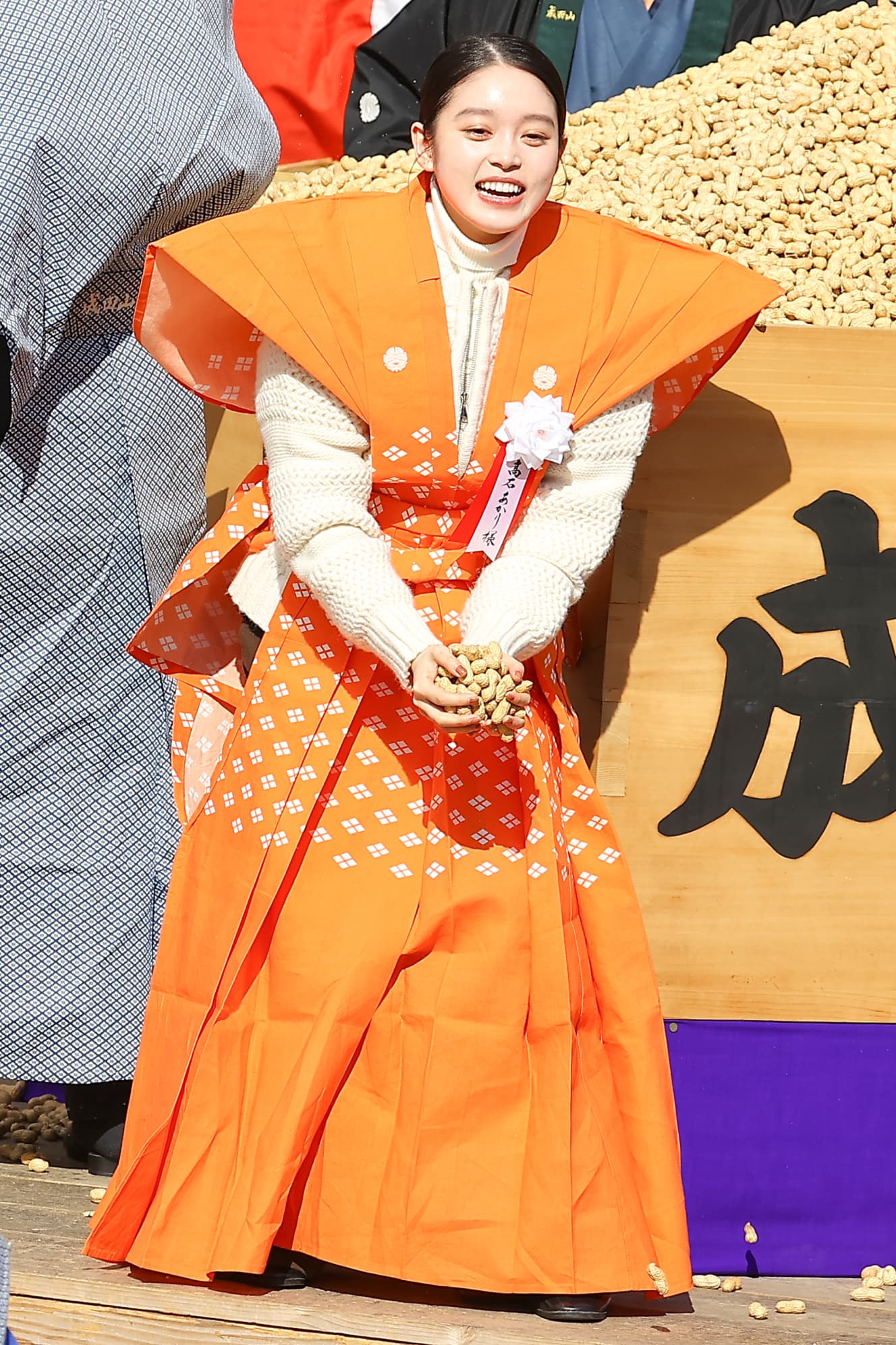 It is said that even demons are converted at Naritasan Fudo, so there is no such thing as “Oni wa soto” in the call to arms. Hamabe and Ikematsu were said to be holding in their hands a large amount of beans stuffed into the largest “Senmasu Daifuku Masu” (150cm square, 80cm high, weighing 200kg) in Japan, and they were throwing them cheerfully with a shout of “Fuku wa uchi! The beans were scattered cheerfully with the shouts of “Fuku wa uchi! Hamabe-san’s beans were scattered with great vigor. Many visitors rushed to the shrine to receive the beans that Ms. Hamabe had scattered,” said one of the visitors.