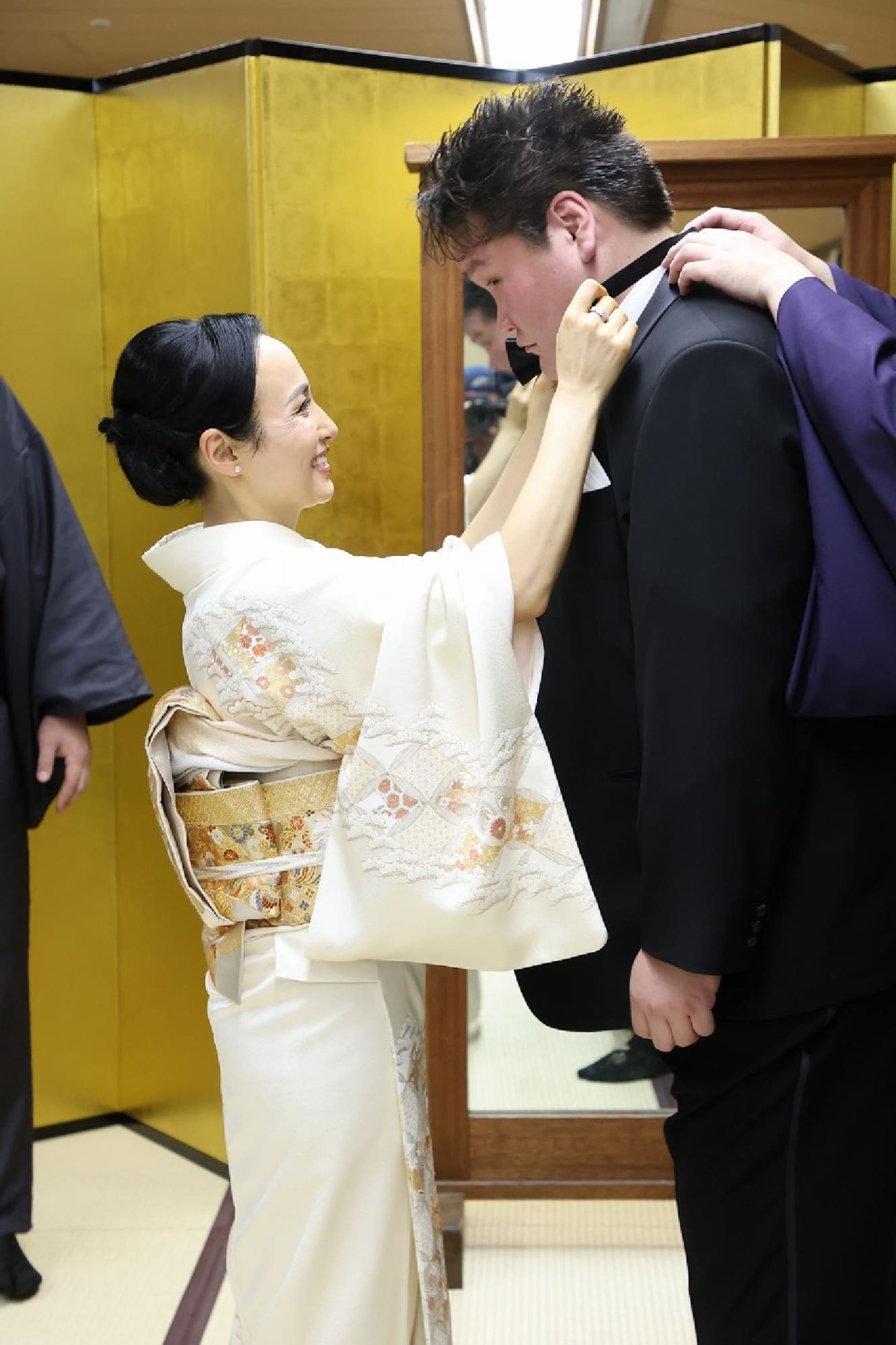 Mr. Hakuho, dressed in a gold dale (Mongolian traditional costume) that he had not worn since receiving the National Honor Award in Mongolia 10 years earlier, put his hand on Terunofuji’s shoulder and said, “Good day to you. Please do your best.” He thanked Terunofuji for his years of hard work.
