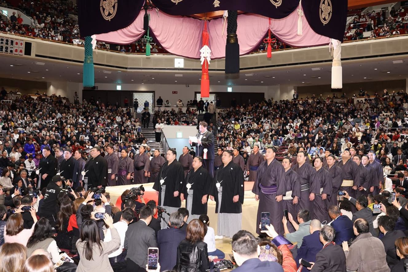The new Isegahama stablemates lined up under the ring, bowing to their fans and supporters.