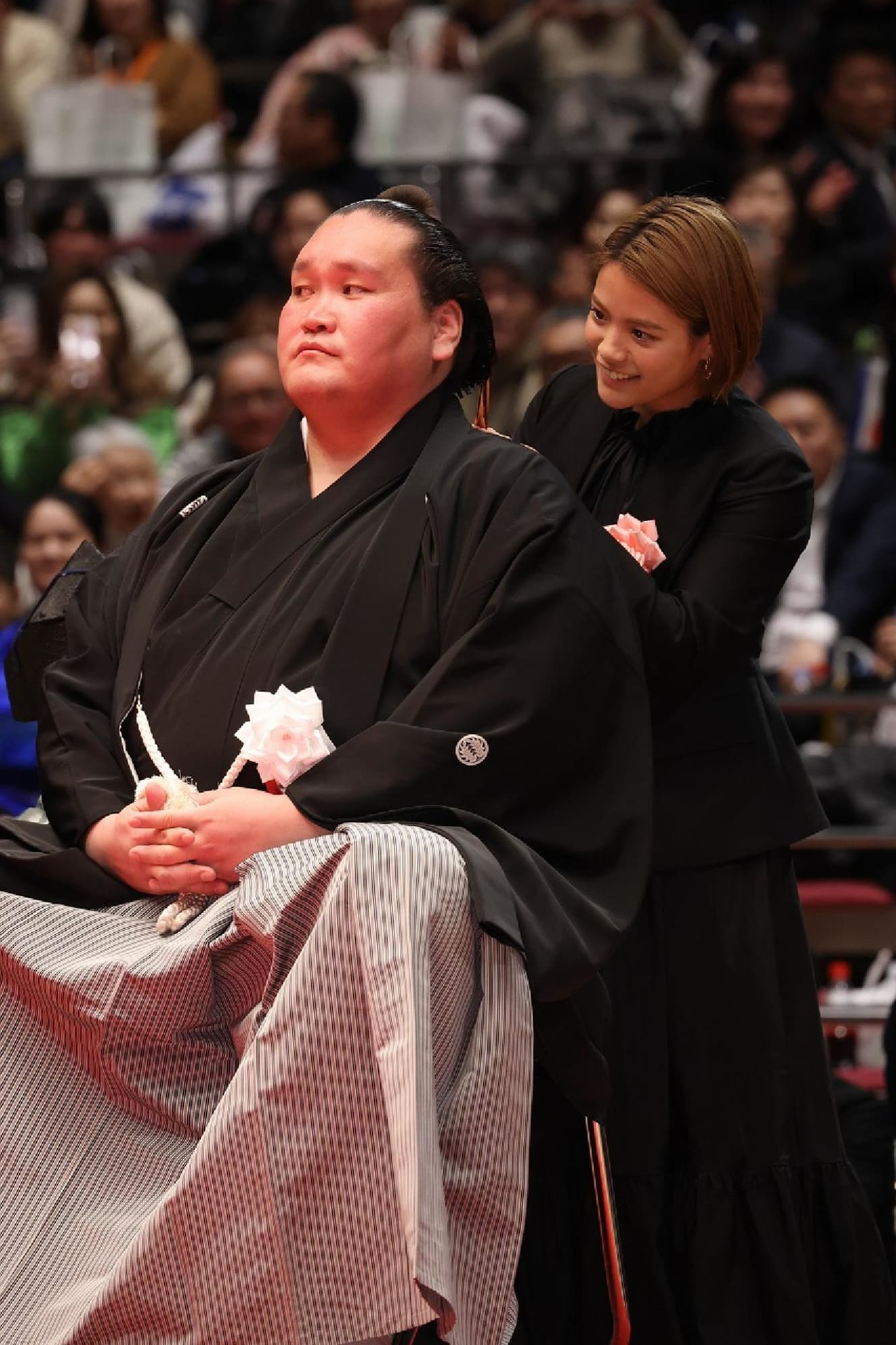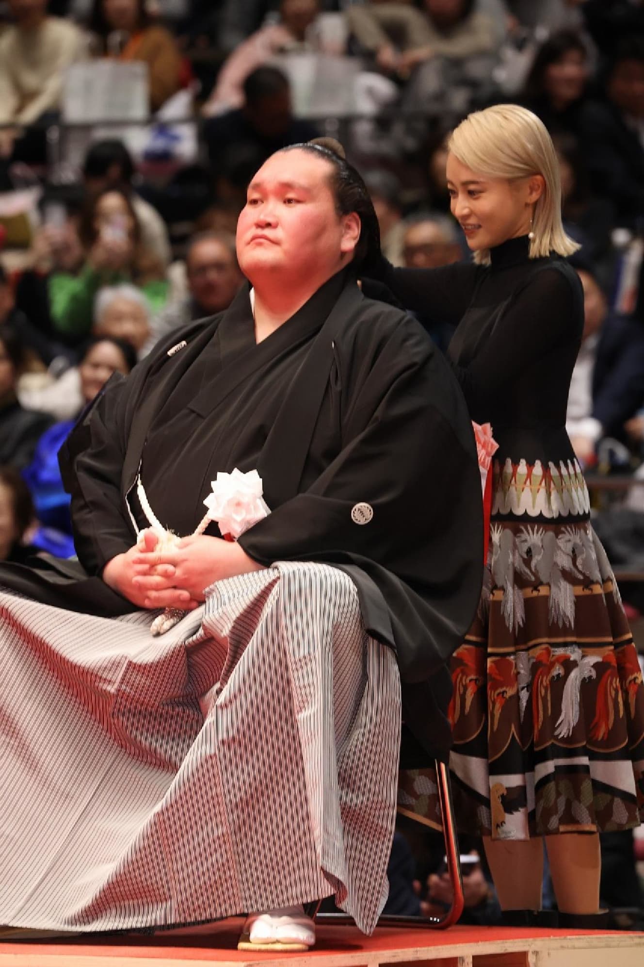Another feature of the haircutting ceremony was that many of the women who came to the event with their older brother, Kazumi (28), including Tokyo Olympic women’s judo gold medalist Abe Uta (25), golf player Momoko Ueda (39), and TV personality Ruriko Kojima (32), also got the shears. The women, who are not allowed in the ring, insert the shears from a custom-designed platform.