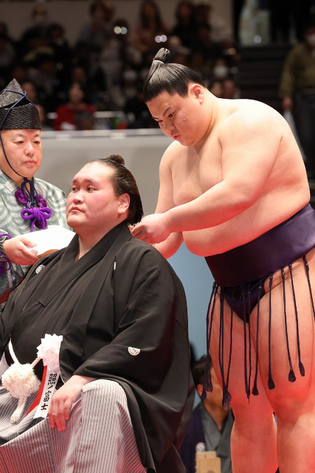Junko Suginomori, the wife of the former Isegahama no Mikata (former yokozuna Asahifuji and current yokozuna Miyagino no Mikata), who had closely watched his fall from ozeki to nidan and then to yokozuna, also put the scissors in with great emotion.