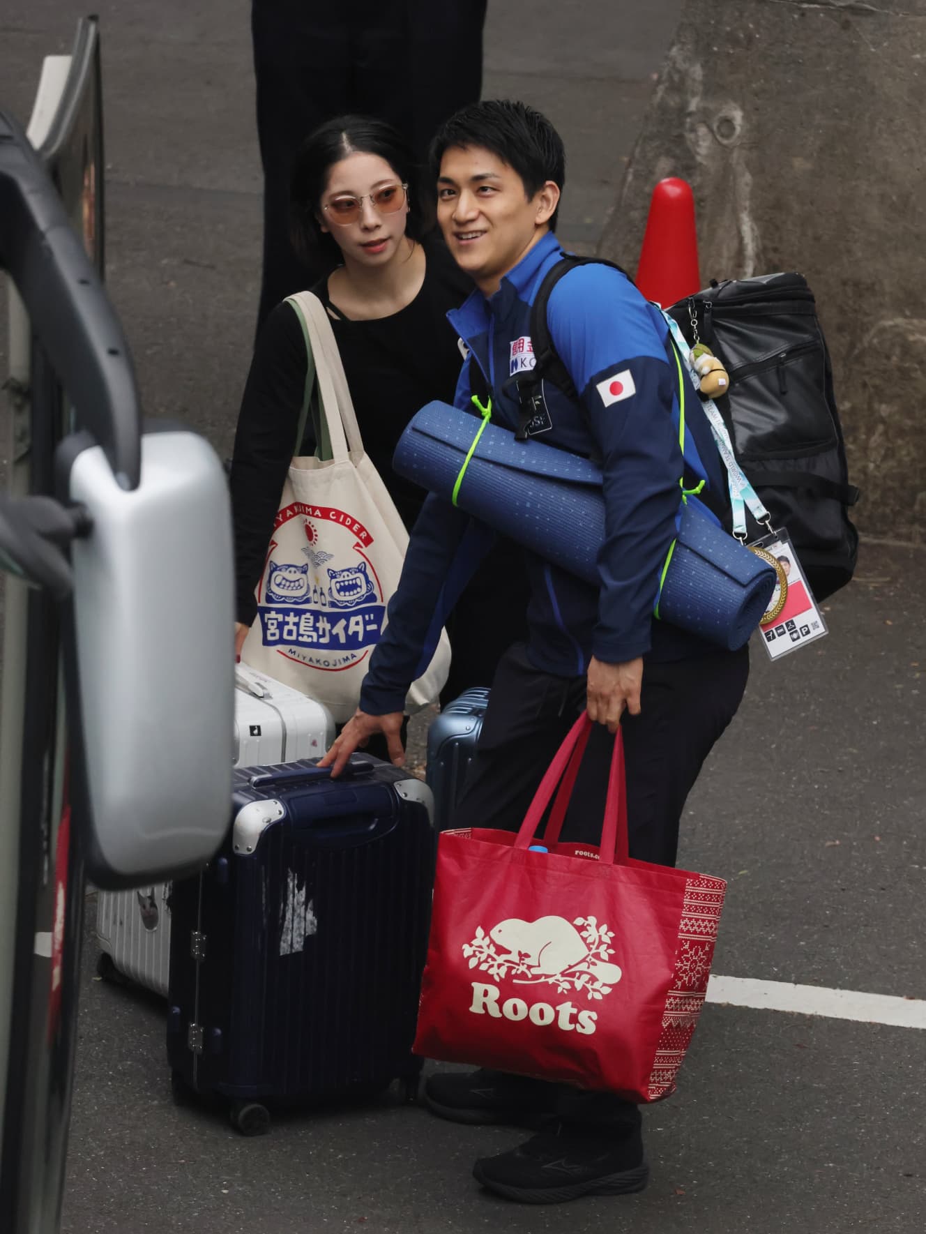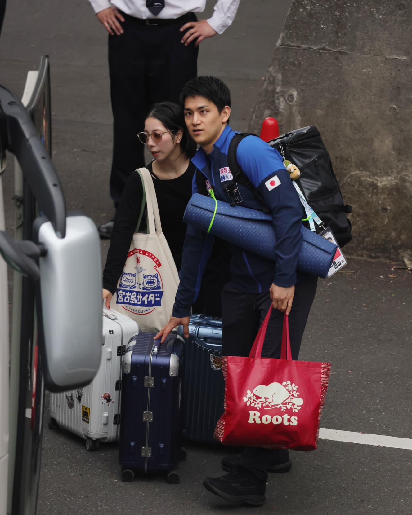 Kihara was dressed in top and bottom jerseys. Kihara was dressed in top and bottom jerseys and carried a large suitcase next to him with large bags under his arms. Miura, on the other hand, was wearing large sunglasses and all in black in a fashionable, celebrity-like style. Kihara was like a “male manager supporting a female celebrity” as he loaded their luggage onto the bus for the trip.