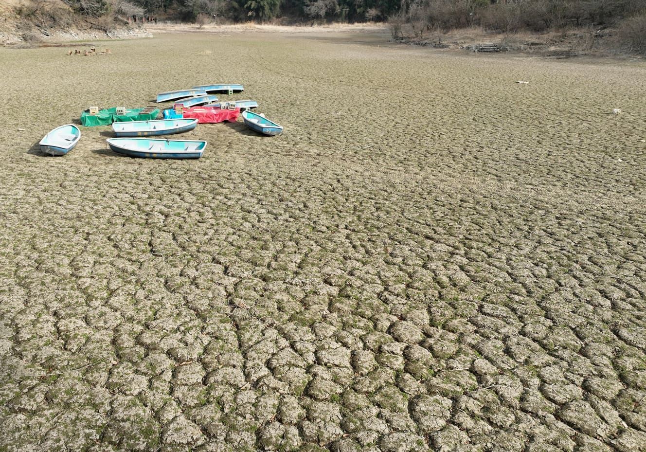 The lake, which until just a few months ago was filled to the brim with water, has dried up, exposing the cracked bottom of the lake.