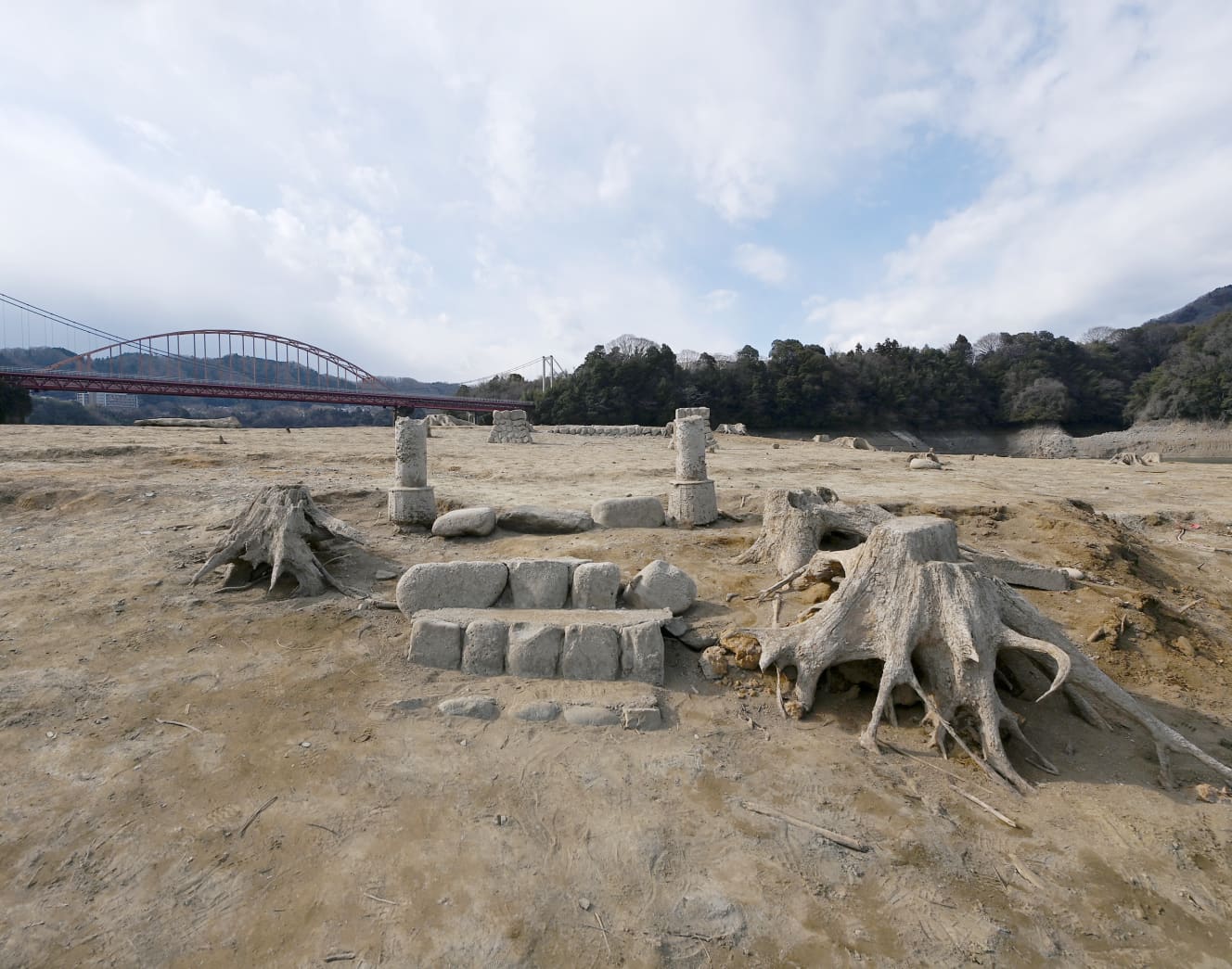 Since Lake Tsukui is a dammed lake, the remains of a village that sank during the construction of the dam about 60 years ago also appeared. These include a structure made of stones, stairs, and tree roots that appear to be the remains of a shrine. They were also probably illegally dumped into the lake long ago. On the opposite shore, an old, dilapidated car was about one-third buried in the ground. There are many onlookers with cameras, hoping to see the bottom of the lake, which is rarely seen.