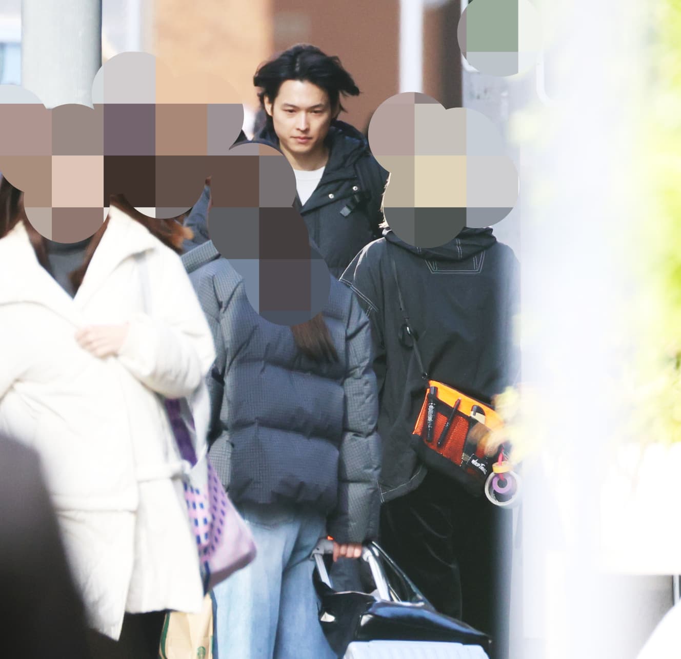 Filming took place in mid-January. Imada stands in a down jacket on a street where many people, including businessmen and young women, pass by. His expression is very anxious. Standing a short distance away, facing Imada, was Matsumura, also wearing a down jacket. After several rehearsals for this scene, it was time for the real performance. Imada was dressed in a neat-looking jacket and gray skirt. Matsumura was in a suit and was filming the same scene. Matsumura was,