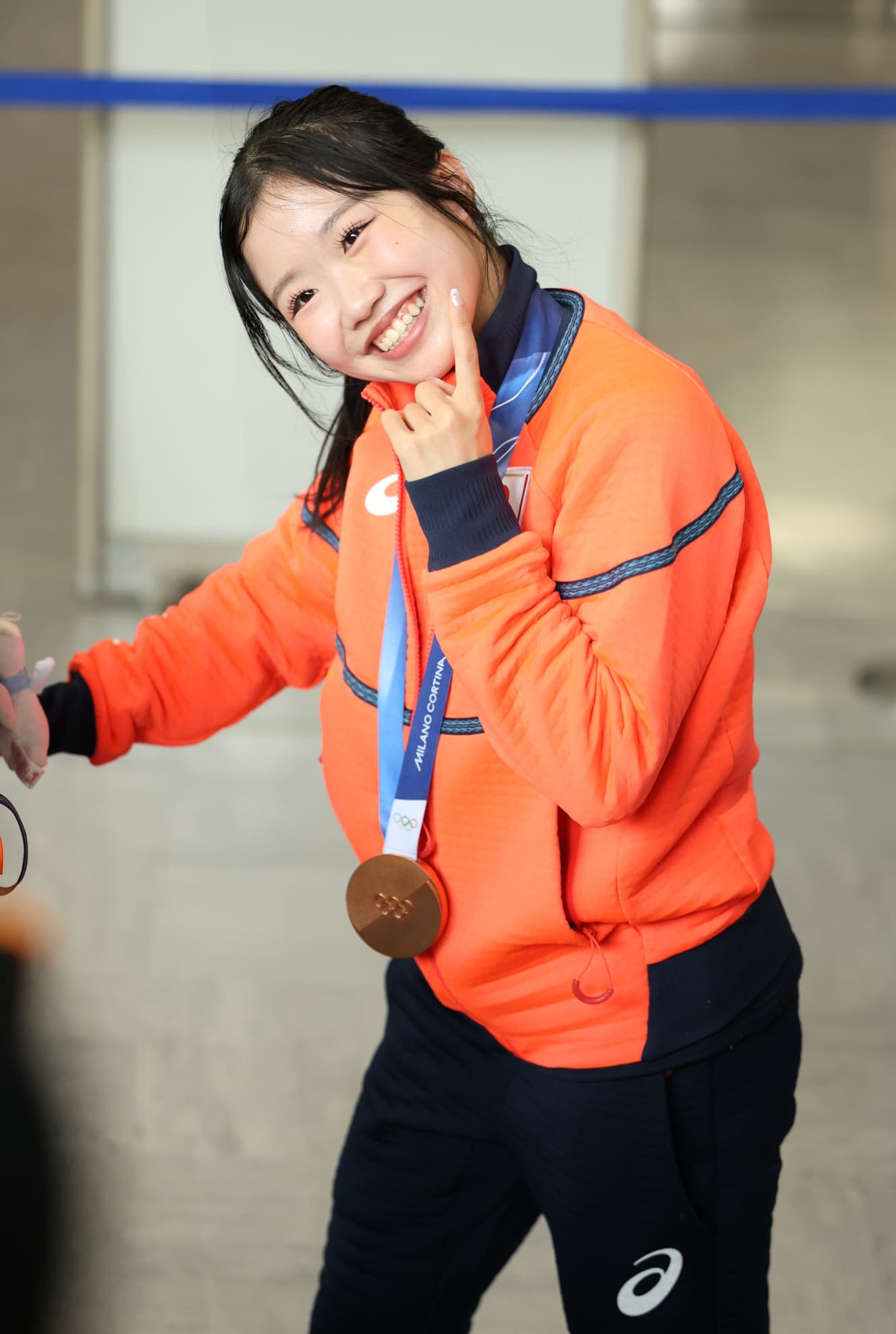 Figure skater Ami Nakai and other medalists return to Japan with their signature “finger on the cheek” pose.