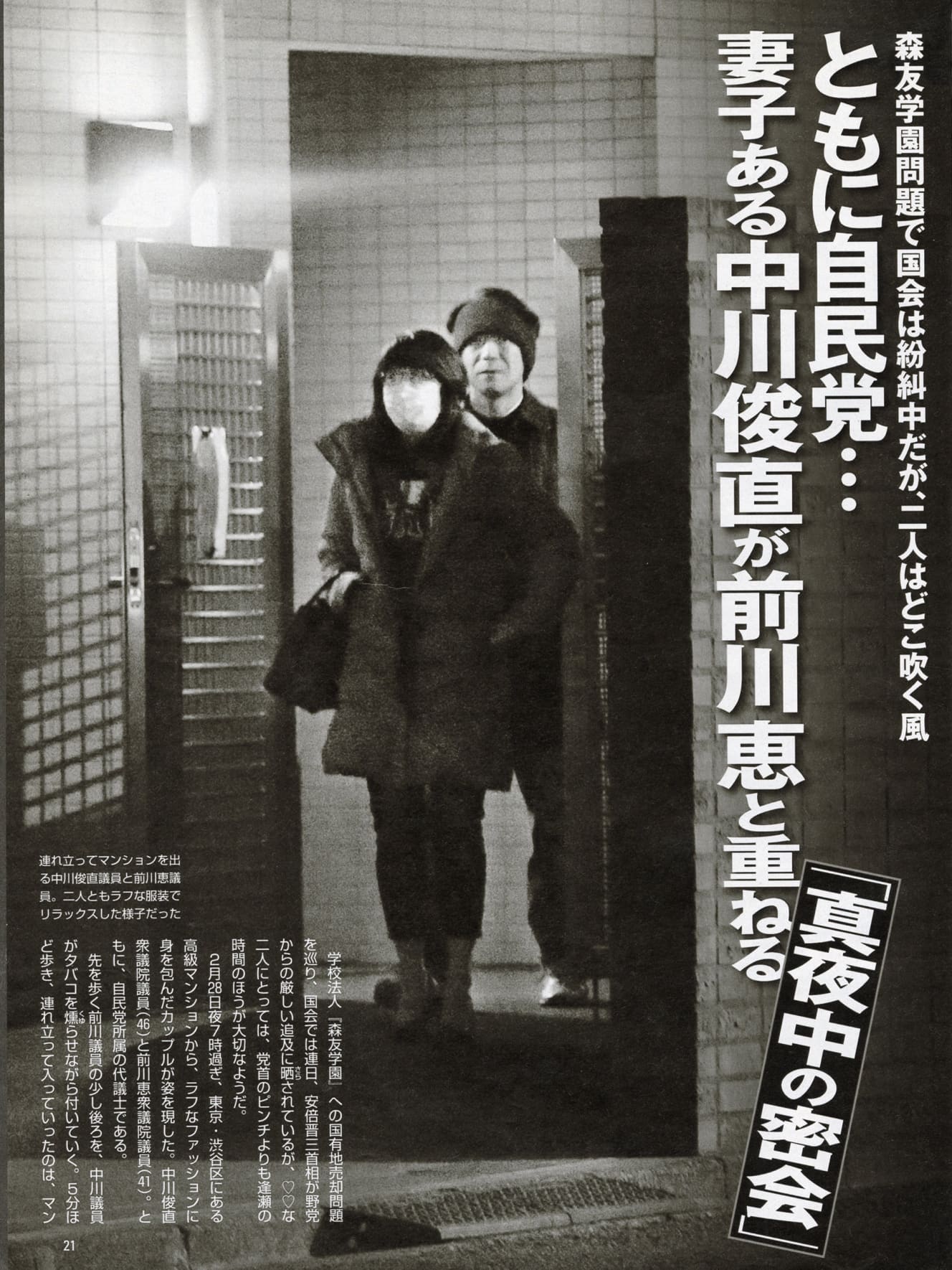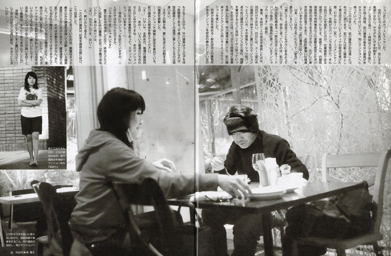 When Mr. Nakagawa was still a member of the Diet, he was in an uproar over allegations of an affair with Senator Maekawa. In February 2005, FRIDAY witnessed Mr. Nakagawa going to the apartment that Senator Maekawa uses as his office. It also reported two shots of them enjoying a meal at a café together.