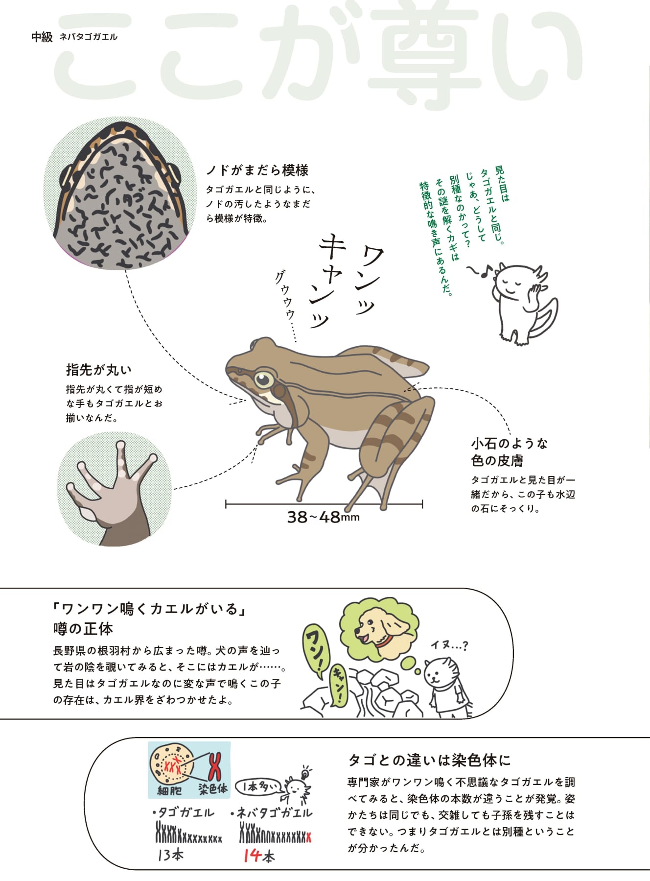 Genetic analysis of frogs began around 2010, and in 2002 it was discovered that the nevatago frog and the tago frog are two different species with different numbers of chromosomes. Although not as doggy-like as the nevatago frog, the tago frog also sometimes croaks. Since they are not identifiable by their appearance, the nevatago frog was previously thought to be a tagog frog.”