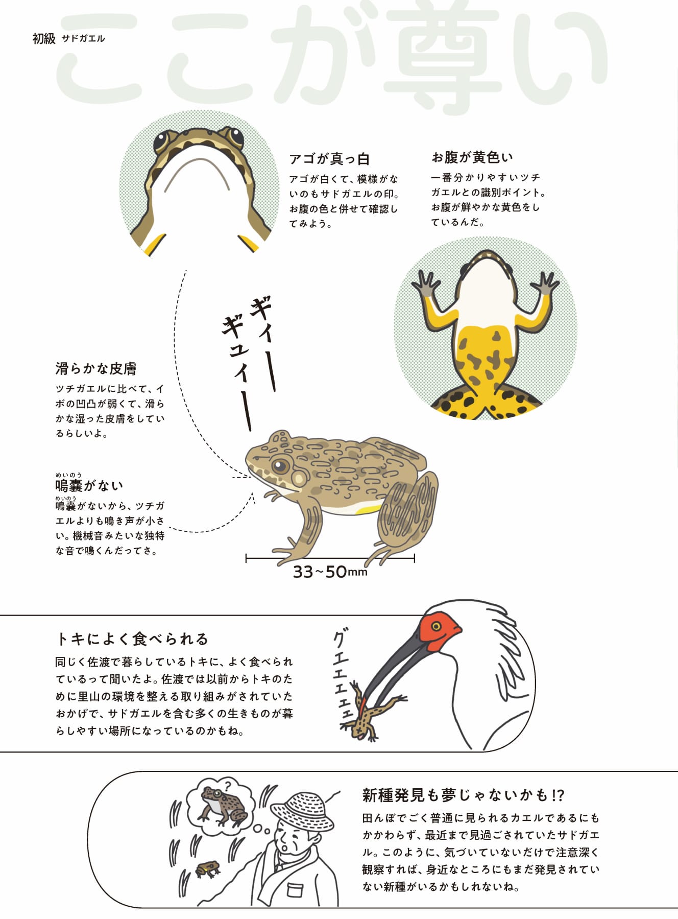 Two species, the Sado Island frog and the Gotoh tag frog, I haven’t met yet,” he said. As their names suggest, they are distributed on Sado Island in Niigata Prefecture and on the Goto Islands in Nagasaki Prefecture. Sado frogs live in the rice paddies of Sado Island and are often eaten by crested ibis. Sado is a pleasant environment for frogs because of its satoyama environment for ibis breeding.