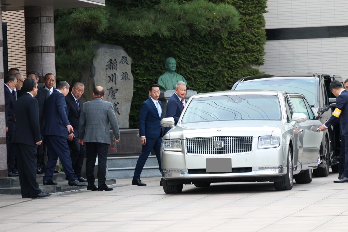 As the Inagawa-kai members lined up inside the hall to greet them, Waka-ta Takeuchi got out of the back seat of the car and entered the hall, exchanging words with Inagawa-kai President Tomeyoshi Sadakata and others who were waiting to welcome them, his expression softening, perhaps because it was a regular meeting. At about the same time, a convoy of vehicles from the Matsuba-kai also arrived. The social gathering began at around 11:45 am.