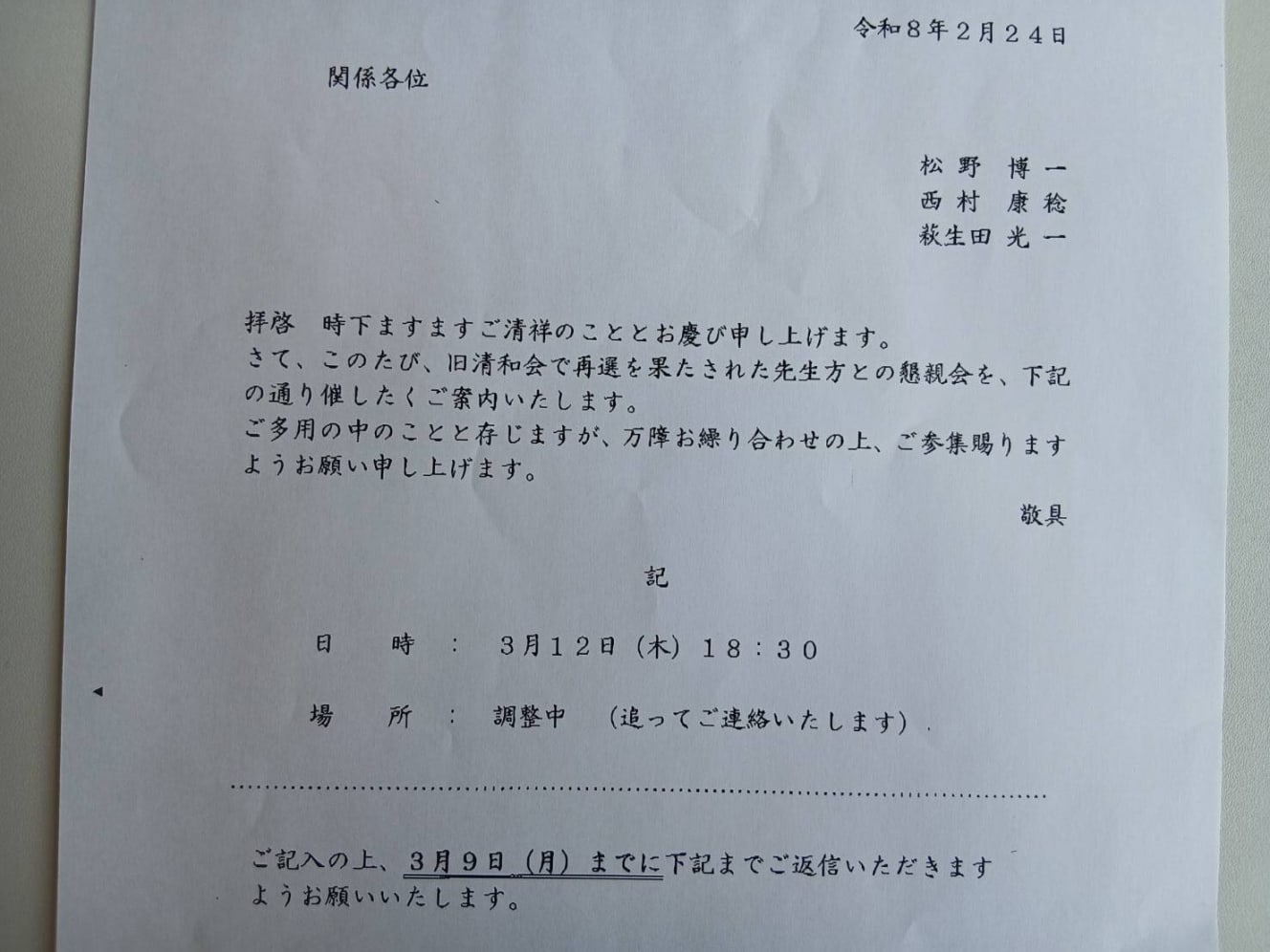According to the participants, the meeting was organized by Nishimura and Kōichi Hagiuda, 62, the deputy secretary-general, and was led by Hidetaka Suzuki, 51, a former parliamentary secretary in the Cabinet Office. The meeting was attended mainly by young Diet members who were not elected in the last Lower House election in 1949, and newcomer Shinichiro Kawamatsu, 45, a member of the House of Representatives, enlivened the event.