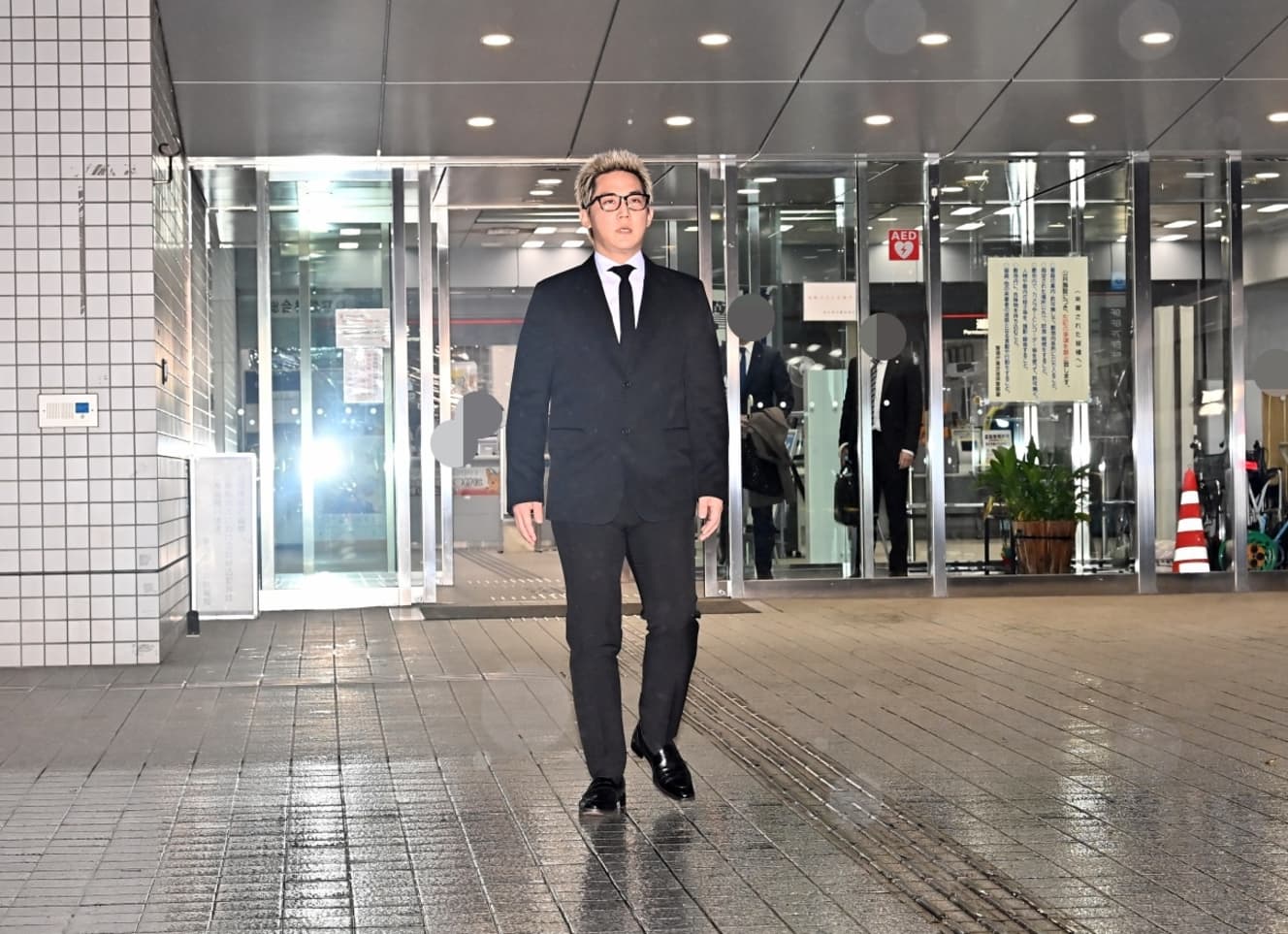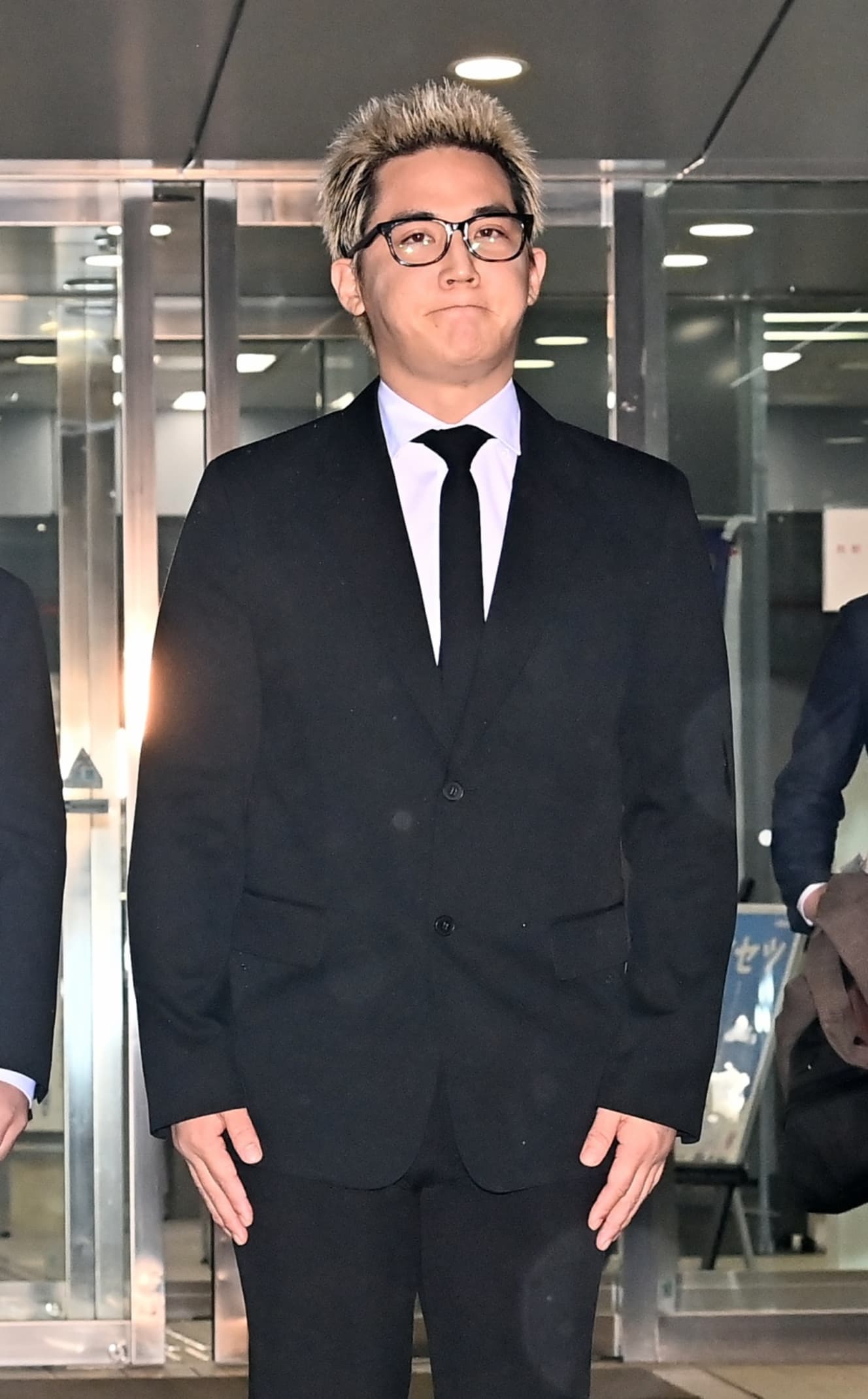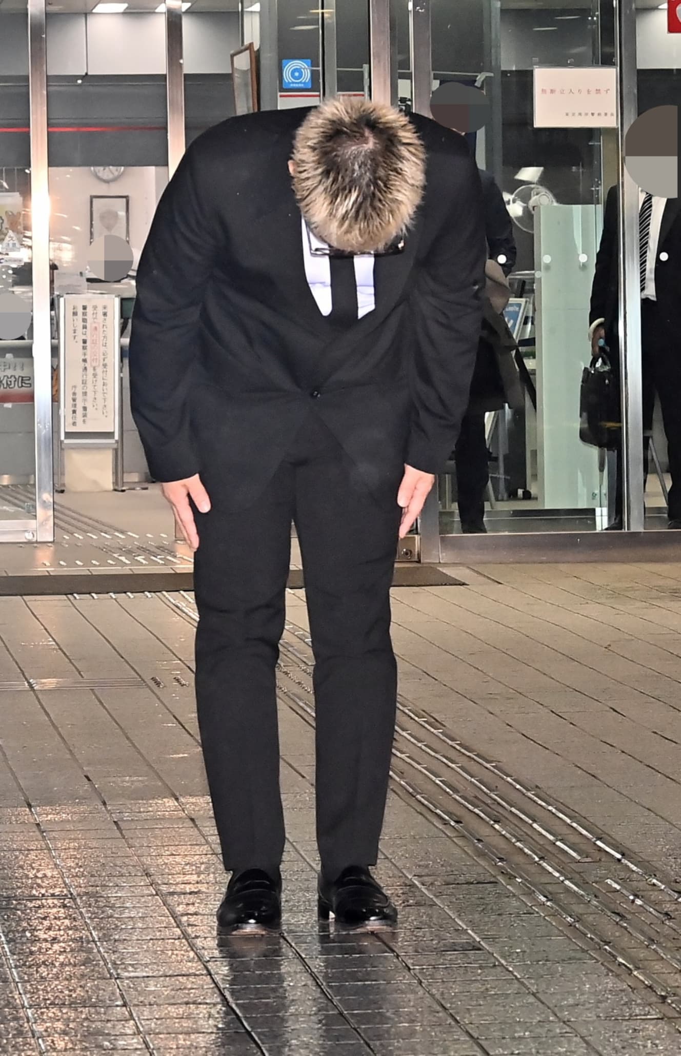 At around 7:30 p.m., accompanied by associates, Sakai paused just before exiting the building and took a deep breath upon seeing the large number of reporters waiting outside. Perhaps due to nervousness, he licked his lips. He then walked straight toward the press, softly saying, “I’m sorry,” and bowed deeply, holding the position for about 13 seconds. When reporters called out, “Do you have a message for your fans?” he did not respond and instead got into a waiting car.