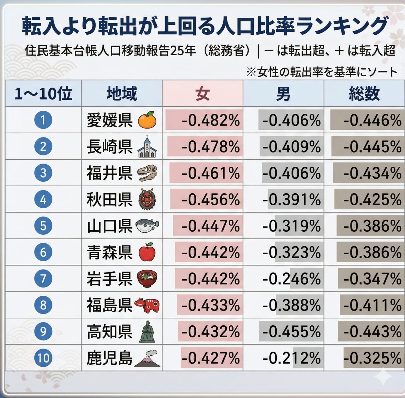 An analysis of the status of in-migration and out-migration by prefecture, based on data from the Basic Resident Ledger Population Movement Report (’25) of the Ministry of Internal Affairs and Communications, reveals a cruel reality.